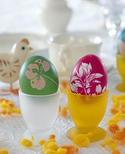 2. Цветики. Возьми отварное яйцо, приложи к нему лист, вставь в капроновый носок (завязав его узлом), опусти в краситель.
