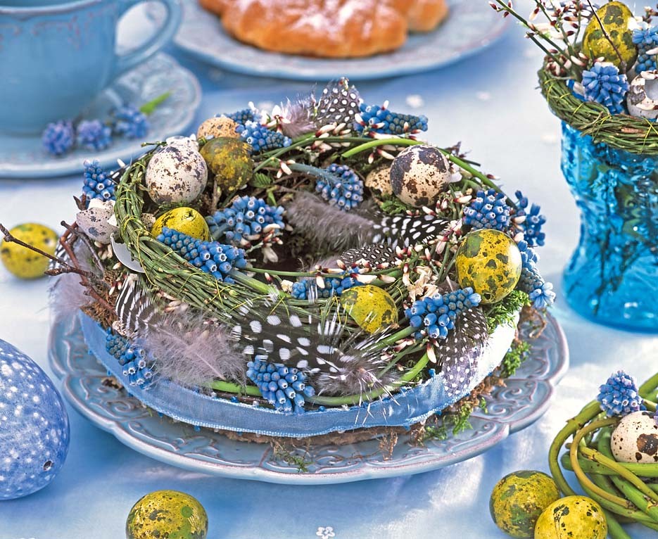 Укрась торжественное семейное застолье декоративным венком, сделанным из различных флористических материалов (веточек, цветов и т.д.) с добавлением маленьких перепелиных яиц (покрашенных или нет – выбор за тобой).