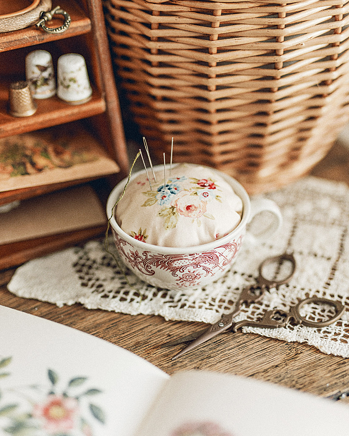 Для тех, кто увлекается рукоделием, небольшую чайную или кофейную чашку можно превратить в очаровательную игольницу. Для этого нужно взять отрез ткани, собрать его по окружности крупным стежком, слегка затянуть получившийся «мешочек» и набить синтепоном. Снова затянуть и спрятать концы ткани внутрь. Готовую подушечку вложить в чашку и поставить на рабочий стол: такая игольница станет настоящим украшением и подарит атмосферу домашнего уюта.