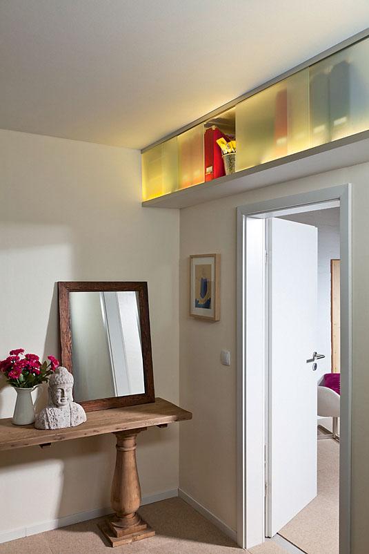 Навесная полка вдоль всей стены (над дверью) с подсветкой и раздвижными пластиковыми дверцами