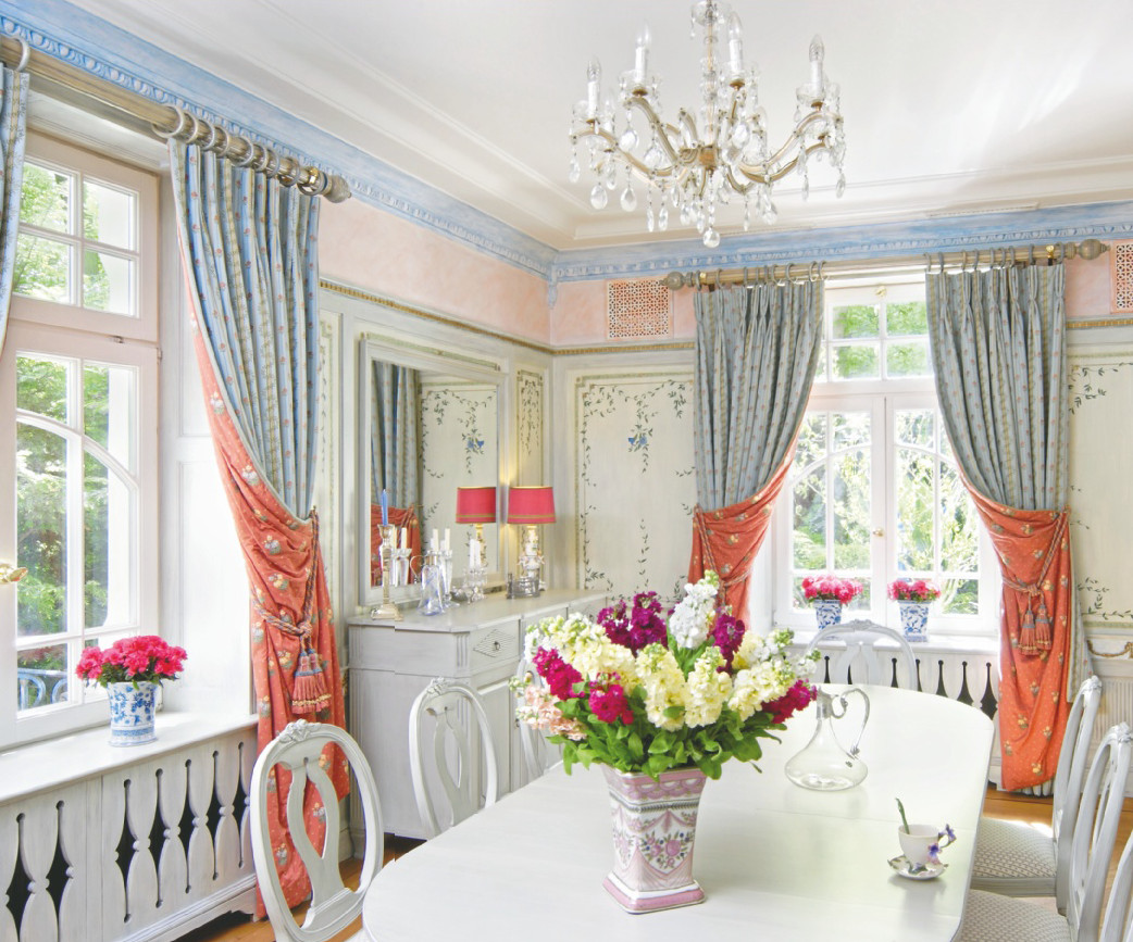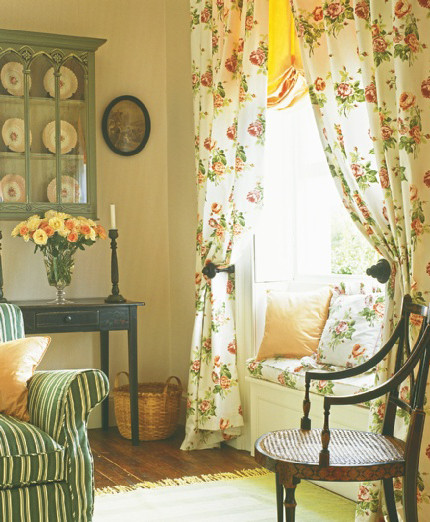 Прованс символизирует близость к природе, поэтому шторы для помещений в этом стиле должны быть из натуральных тканей (льна, ситца) с цветочным орнаментом. Обычно это длинные полотна от потолка до пола.
