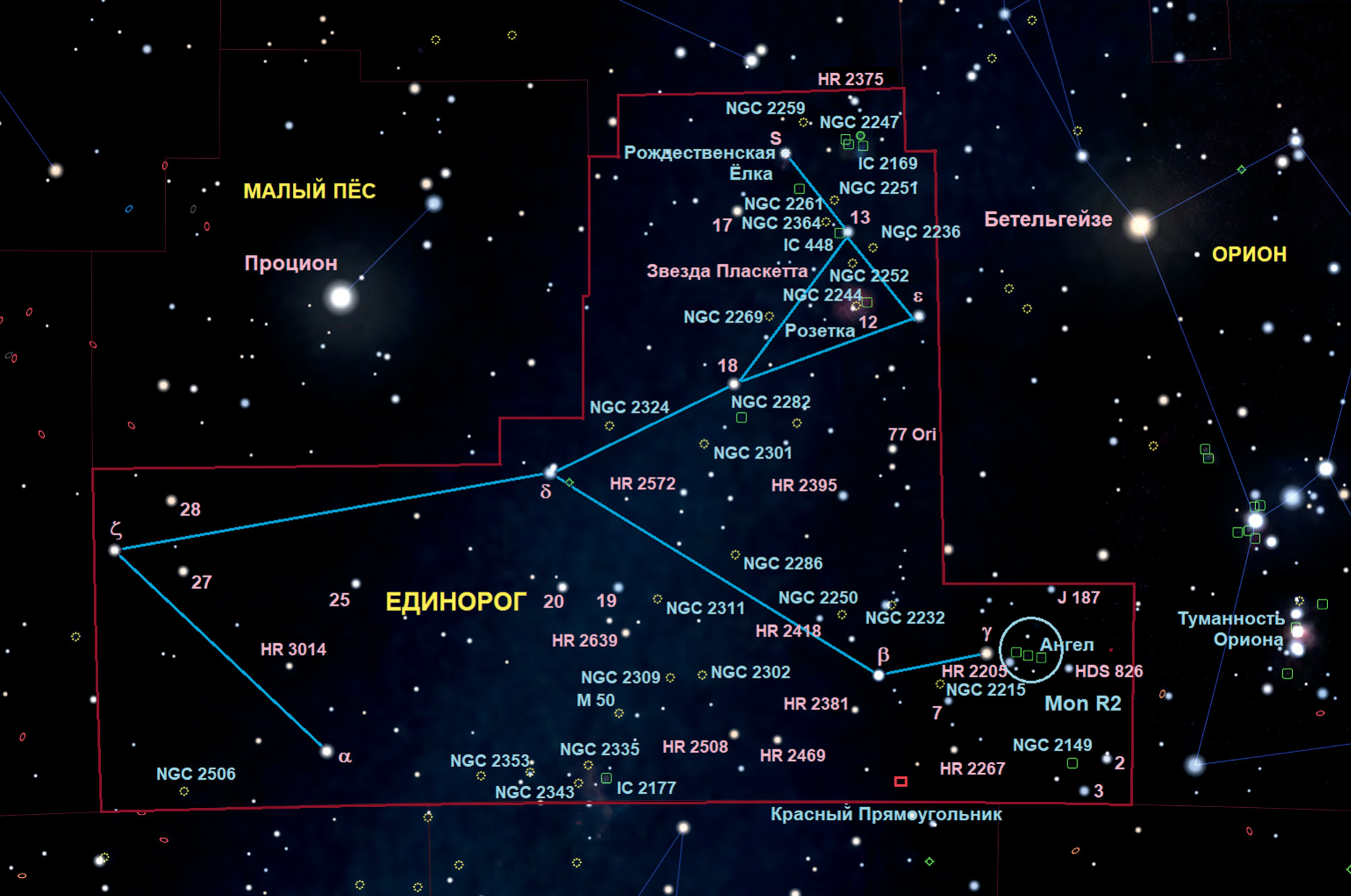 Единорог (на латыни Monoceros, сокращение Mon) — экваториальное созвездие среднего размера, по площади занимающее 35-е место из 88 известных созвездий. По числу же звёзд, видимых невооружённым глазом (85 звёзд ярче 6m), оно находится на 24-м месте. Такое большое количество звёзд неудивительно, поскольку созвездие лежит в пределах полосы Млечного Пути. Но при этом оно очень тусклое — в нём всего четыре звезды ярче 4m: β Mon (суммарно 3,74m), α Mon (3,94m), γ Mon (3,96m) и ε Mon (суммарно около 4m). Поэтому не приходится удивляться, что Единорог не был известен древним грекам, а был введён голландским астрономом, богословом и картографом Петром Планцием лишь в 1612 году. Это мифическое животное в средние века считалось христианским символом чистоты и было связано с Девой Марией и Иисусом Христом, что, видимо, и натолкнуло Планция на идею названия. К слову, единорог изображён на государственных печатях царя Ивана Грозного, на гербах некоторых видных российских дворянских родов и даже на знамени Ермака, с которым он покорял Сибирь.