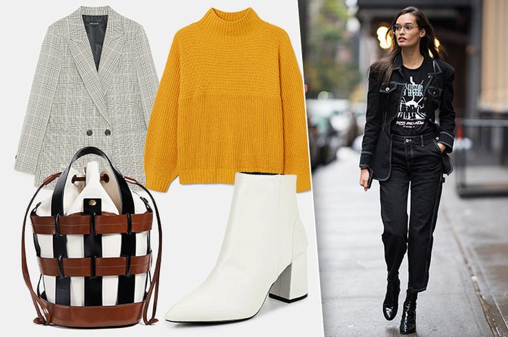 Главный его элемент - это, конечно же, черные джинсы с высокой талией, свободного кроя и длиной до щиколотки. Их идеально дополнят объемная джинсовая куртка (в более прохладные дни просто набрось сверху меховое пальто черного цвета), лаковые ботильоны с заостренным мыском и черная футболка (с неброской белой надписью или принтом). А с ролью акцента в этом комплекте отлично справится сумка-мессенджер со "змеиной" вставкой.