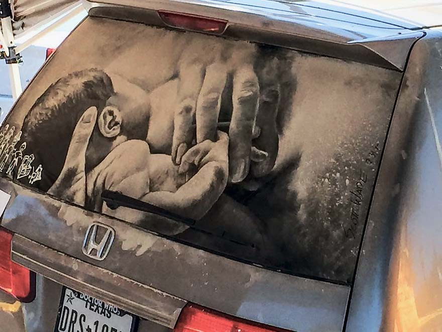 Чего-чего, а грязи в жизни парня было достаточно, ведь жил он в сельской местности, где каждая поездка по длинной грунтовой дороге к дому и обратно покрывала автомобиль тонким слоем пыли, известняка и глины. По признанию Скотта, невозможно было устоять от того, чтобы не начертить на заднем стекле – самой пыльной части машины – какую-нибудь надпись или рожицу. Со временем Уэйд стал экспериментировать в этом деле и довольно быстро понял, что грязный автомобиль – самый настоящий холст, кистями для которого могут быть подушечка пальца, кончик ногтя и даже палочка от съеденного эскимо. Каждый «инструмент» давал свою линию и позволял творцу комбинировать их как угодно для создания впечатляющих картин.