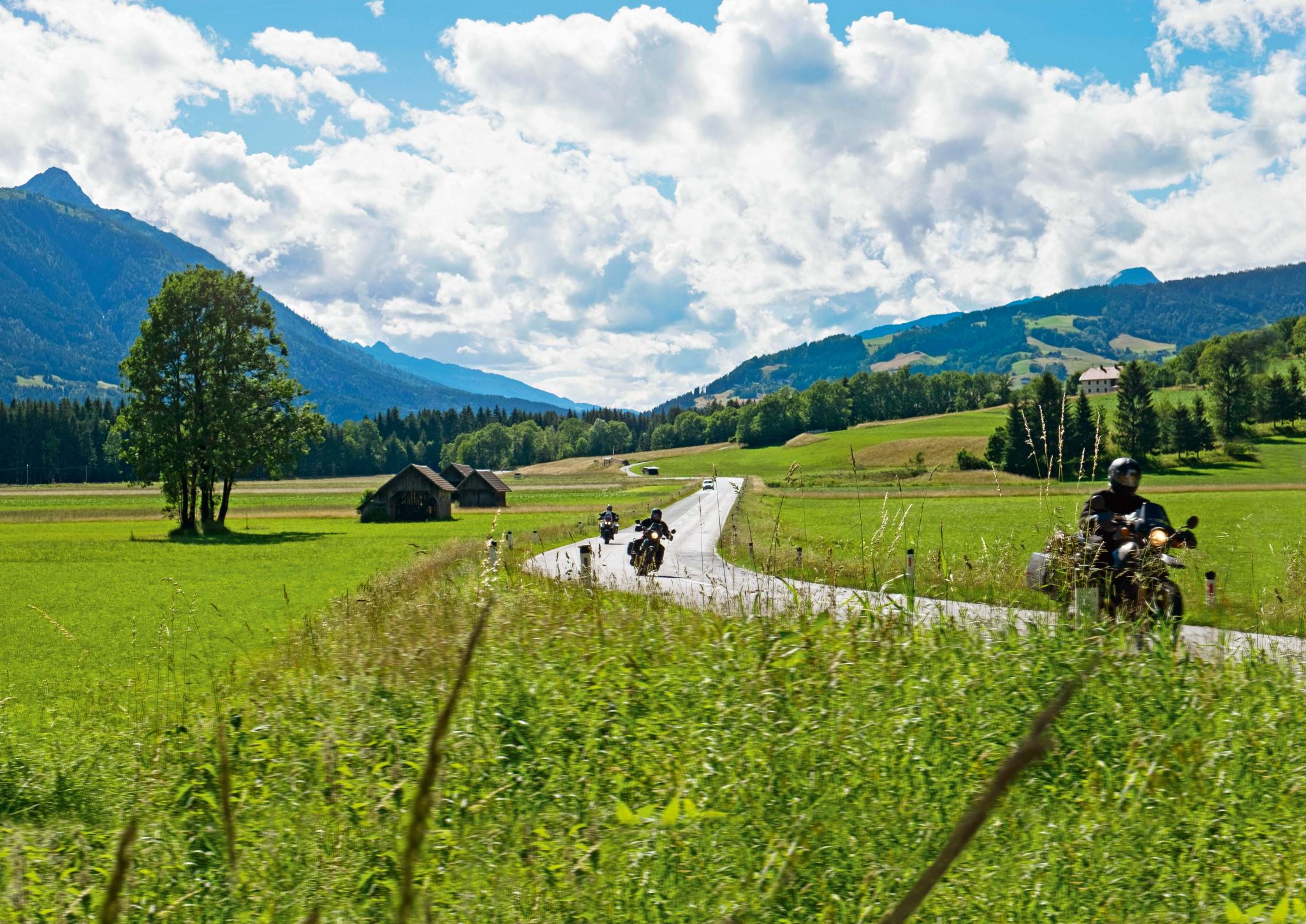 Мотоциклы в эти места вписываются очень гармонично: на горных дорогах их встречается очень много. Одиночные путешественники, маленькие группы и целые колонны. Они стартуют в маленьких городках и добираются до самых высоких перевалов. Дорога поднимается, переваливает через холм и спускается к Трибену, а затем начинает новый – извилистый – подъем до Юденбурга.