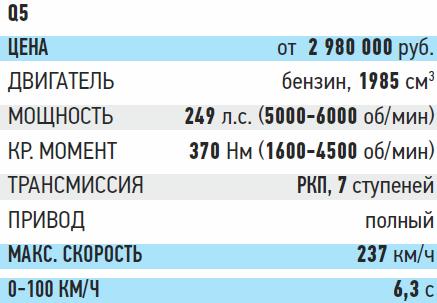В России заказать Q5 вы можете только с бензиновым 2.0 TFSI мощностью 249 л.с. в паре с коробкой S-tronic c двумя сцеплениями. Ключевые качества такого Q5 – умение идеально подстроиться под водителя. Безупречная эргономика и качественный интерьер делают езду максимально комфортной, безопасной и приятной. И в длинной дороге вы по достоинству оцените этот баланс.