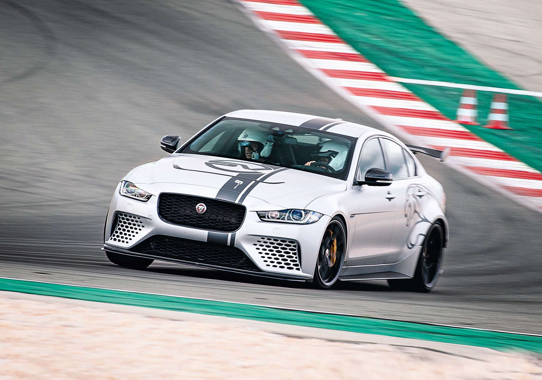 В основе проекта — серийный XE. От него сохранился алюминиевый силовой каркас, компоновка и часть интерьера. Остальное — все остальное — подвергли доработкам или спроектировали с нуля специалисты подразделения SVO (Special Vehicle Operations). Наибольшее внимание уделили ходовой части и аэродинамике. В подвеске — сдвоенные пружины, предусмотрена возможность опустить автомобиль на 15 мм для езды по треку. Колеи стали шире на 24 мм спереди и на целых 73 сзади. Автомобиль обут в специальные шины Michelin Sport Cup 2, за замедление отвечает углекерамическая тормозная система. Про аэродинамику вы можете прочитать, перевернув странцу, — мы подробно рассказали, что сделали инженеры, чтобы гарантировать устойчивость в том числе и на очень высоких скоростях (максимальная достигает 332 км/ч).