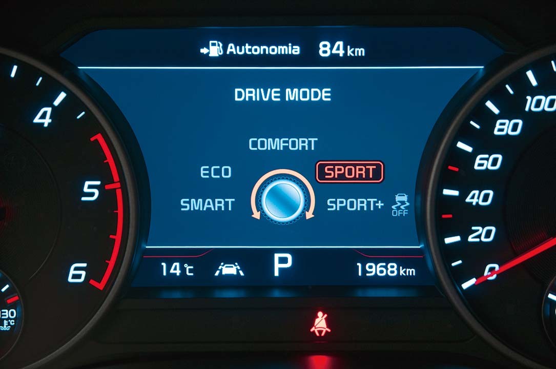 Водительское место скомпоновано по-спортивному. Посадка низкая — ноги вытянуты, а подушка кресла расположена всего в 45 см над асфальтом. Руль стоит идеально вертикально, средний наклон составляет 17°. Он небольшого диаметра (37 см), обод скошен в нижней части, чтобы не мешать ногам. У кресла плотный хват, достаточный, чтобы удерживать корпус, но не затруднять посадку и высадку. Электрорегулировки с большим диапазоном позволяют устроиться очень удобно. Щиток состоит из двух больших аналоговых приборов, разделенных центральным TFT-экраном, на котором отображаются данные бортового компьютера. Передняя панель — простая и почти минималистская — сочетается с высоким и выраженным тоннелем, четко разделяющим передние места и тянущимся до заднего ряда.