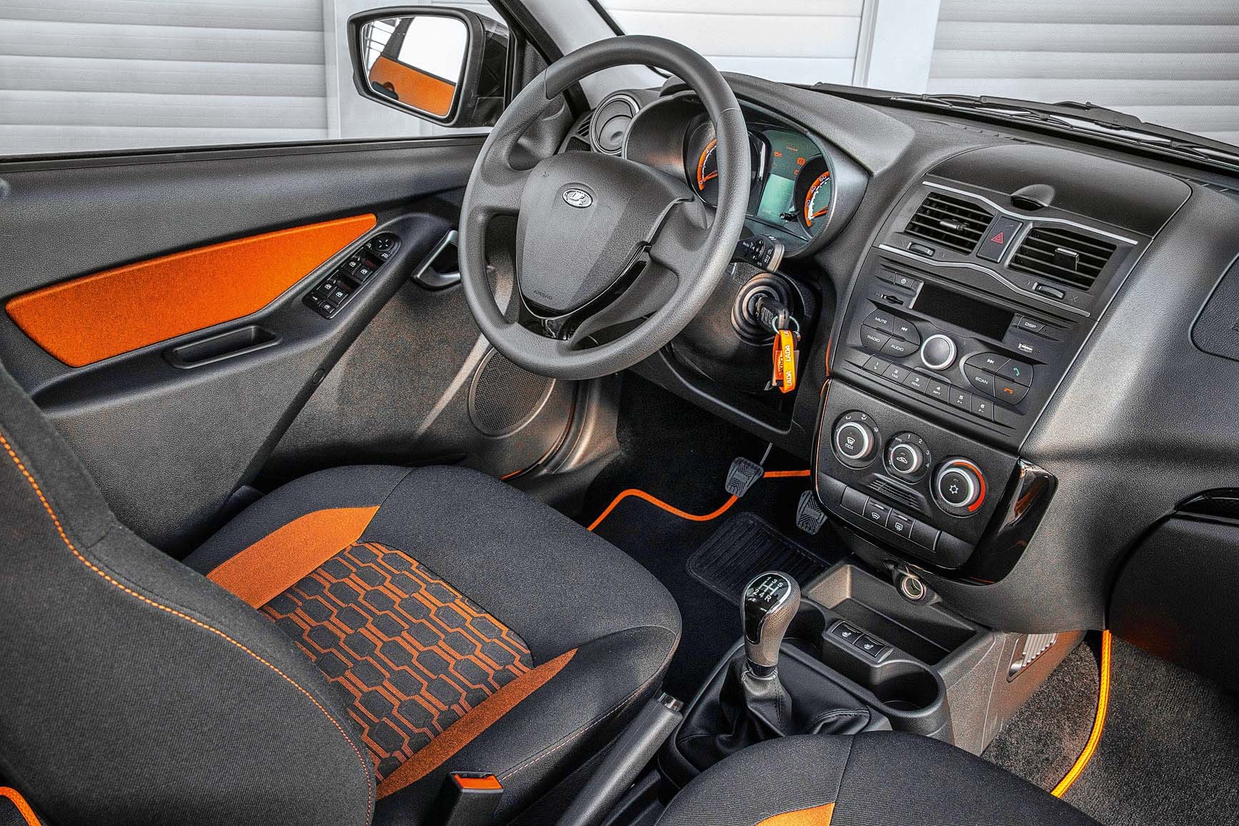 Приподнять настроение покупателям по идее должны и те новшества, которые экс-Kalina получила с переходом в семейство Granta. Передняя часть полностью оформлена иначе, по-грантовски, а Cross вдобавок отличается пластиковым обвесом, серебристыми щитками под бамперами и цветами кузова. В арках крыльев появились мягкие шумопоглощающие вкладыши (и поглощают они, похоже, на славу). Форсунки стеклоомывателей спрятаны от потока холодного воздуха под кромку капота. Замок багажника оснастили электроприводом и удобной кнопкой отпирания. Мелочи, а приятно. В салоне видим обновленные грантовские кресла и возможное по желанию веселенькое Cross-оформление обстановки ярко-оранжевыми фрагментами.