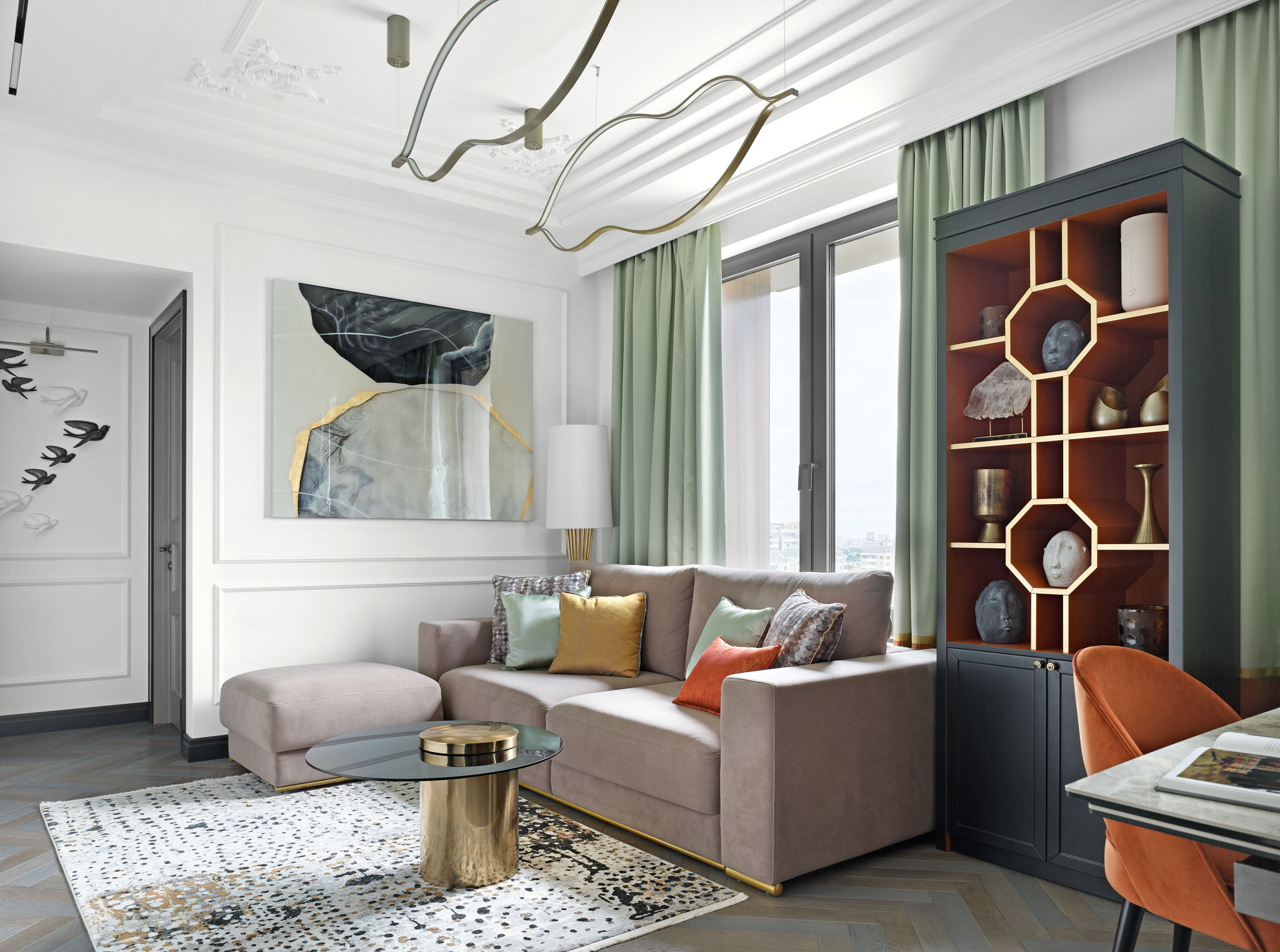 Квартира находится в клубном доме ЖК Vavilove. Высокий этаж в совокупности с большим количеством панорамных окон—несомненный плюс пространства. Но в первоначальном виде планировка от застройщика имела ряд неудобств: узкая прихожая, лишённая естественного света, с несущей балкой посередине, длинный тёмный коридор, ведущий в комнаты, и самый главный недостаток—отсутствие объединённой кухни–гостиной, где домочадцы могли бы собираться и встречать гостей. «Мои заказчики—семья с двумя детьми,—поясняет автор проекта Влада Масорина.—Они живут в другом городе и в Москву приезжают несколько раз в год на каникулы. Со временем супруги решили жить в собственной квартире, а не останавливаться в отелях. Моей главной задачей стало размещение трёх изолированных спален (двух детских, спальни родителей со своей гардеробной), двух санузлов, постирочной, общей гардеробной и, конечно же, просторной общественной зоны».