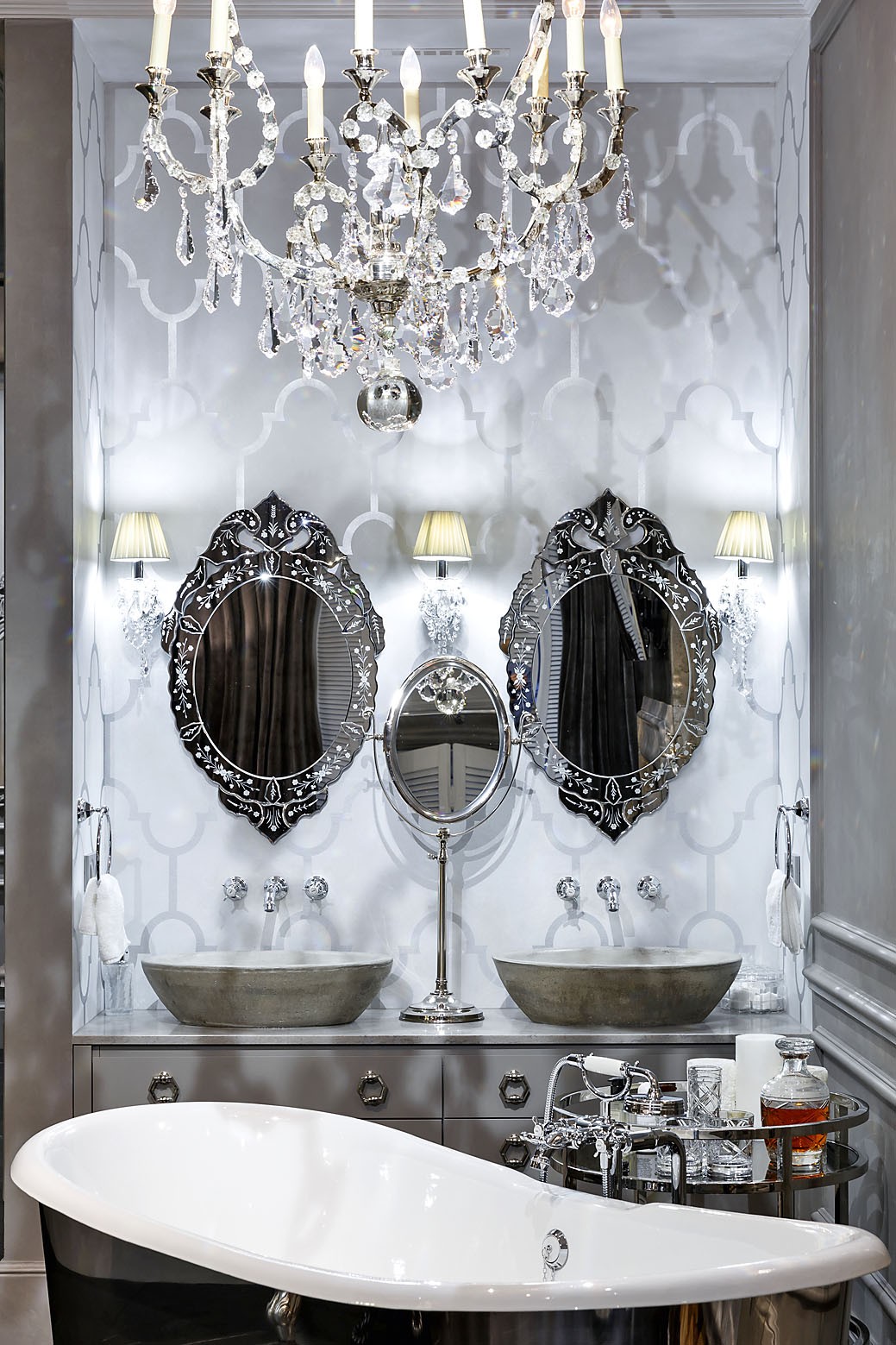 Эта отдельно стоящая ванна и пара умывальников расположены непосредственно в спальне и соседствуют с камином. Такова была идея заказчицы, которую удалось реализовать. Таким образом помимо кровати в интерьере появился ещё один смысловой центр. Стены комнаты окрашены в сложный серый оттенок, бетонные раковины и тумба под ними изготовлены по авторским эскизам. А санузел с душевой кабиной выполнен в чёрном цвете, но в той же стилистике».