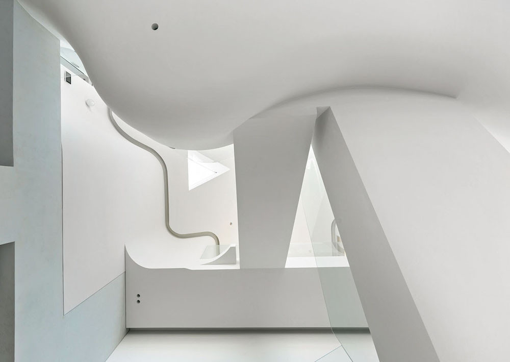 Художественный образ, которым руководствовался Ким Хё-Ман, — облако. «Название проекта — HO-UN — буквально означает «Облако над озером». Оно идеально подходит для легкого, парящего дома с невесомой крышей», — говорит автор проекта. Сам дом представляет собой сложное многоуровневое пространство — оригинальные конструктивные решения сочетаются с ощущением простора и воздуха. На трех уровнях расположились четыре спальни, большая кухня-гостиная и уединенная зона под крышей. Динамика — визитная карточка студии: мостики и переходы соединяют помещения на этажах разной высоты, а диагональные и волнистые линии задают ритм. На третьем уровне, над гостиной, архитектор расположил зону в необычной форме облака — по его задумке, здесь может собираться вся семья.