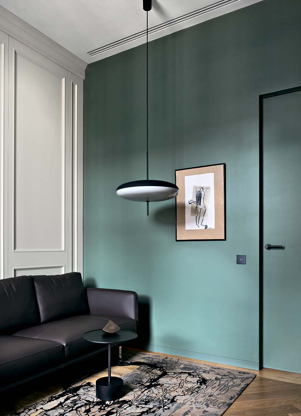 Чтобы каждый из домочадцев чувствовал себя максимально комфортно, дизайнеры сформировали пространство так, чтобы у всех было своё личное пространство. На первом этаже оборудовали гостиную с выходом на открытую террасу, где семья может проводить время вместе, хозяйскую спальню, большую кухню, гардеробную, кабинет, гостевой санузел с душевой и хозяйственную комнату. На втором этаже расположились апартаменты сына–подростка. Перед дизайнерами стояла задача создать современное пространство с элементами дореволюционных интерьеров. И они постарались органично вплести в общую канву элементы классики — так, наряду с системой «умный дом», сенсорными многофункциональными переключателями Basalte Sentido для управления освещением и музыкой, модными системами освещения и дизайнерской кухонной мебелью здесь появилась изразцовая печь, двухстворчатые двери, филёнчатые стеновые панели и паркетные полы. «Мы оформили квартиру в соответствии с самыми высокими стандартами качества в современном понимании, — рассказывает Айя о дизайн–концепции. — Но кроме бытового комфорта важна и эстетическая составляющая, визуальная красота. Заказчики хорошо разбираются в дизайнерских марках, им нравятся итальянские и скандинавские бренды, но они были готовы ещё глубже погрузиться в эксперимент и пробовать что‑то новое, нестандартное. Так, для гостиной мы подобрали легендарное кресло Utrecht от Cassina, изначально созданное в 1935 году для универмага Metz & Co в Амстердаме, для столовой выбрали яркие воздушные светильники от Bocci из разноцветных стеклянных сфер, а интерьер в целом оснастили мебелью и светом ведущих европейских фабрик — таких, как Cassina, Poliform, B&B Italia, Minotti, Molteni&C, Valcucine, Porro, Bert Frank, CTO Lighting, Louis Poulsen...».