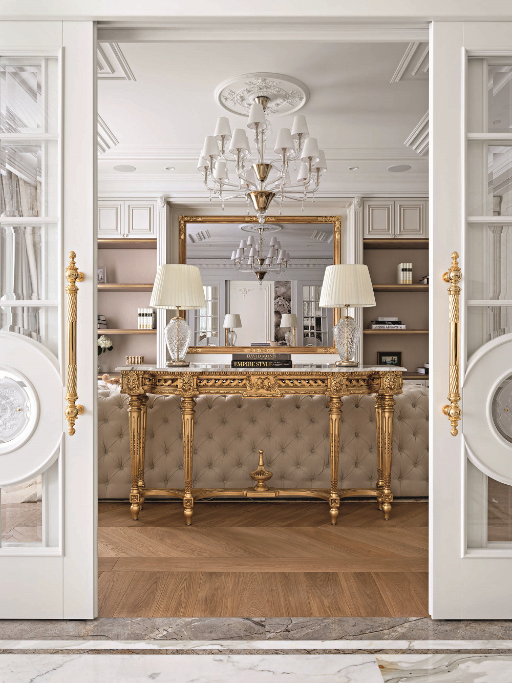 Планировка квартиры ясная и комфортная: справа от входа — парадная зона, состоящая из гостиной и кухни-столовой, слева — приватная, со спальнями и кабинетом. В спальной зоне удалось выделить место для двух отдельных гардеробных и при этом сохранить большое пространство для ванной комнаты. В квартире три санузла, а также есть маленькая, но функциональная постирочная. На планировочное решение повлияли несущие колонны и расположение мокрых зон, поэтому не получилось избежать коридоров, но их задействовали для создания дополнительных мест хранения. А самое главное, что коридор между приватной и парадной частями квартиры удалось превратить в элегантный, классический по стилю холл — за счет узора на полу, выполненного в технике инкрустации латунью, и архитектурно выразительного потолочного купола. «Он получился вследствие грамотной работы с высотами, — объясняет управляющий проектом Александр Пригодич. — Часть потолка в коридоре пришлось занизить для прокладки системы вентиляции, но в центральной точке мы сохранили высоту 3,5 метра и подчеркнули ее куполом». Дополнительным акцентом в этой зоне служит знаковая хрустальная люстра Baccarat. В этой квартире есть и второй подобный купол — он расположен на потолке в столовой над обеденным столом: центр купола и стола находится на единой оси. Акцент сделан на работе с природным рисунком мрамора: с помощью раскладки и естественного узора камня на полу создали центр композиции, который совпал с центром стола и купола. Благодаря таким деталям интерьер выглядит безупречно, а чтобы придать ему живость, его дополнили красивыми акцентными вещами. Это, например, золоченая резная консоль и камин в гостиной. Или, допустим, люстра в столовой: в солнечном свете кристаллы создают фантастическую игру бликов. «Этот интерьер по сути эклектичный, с элементами современной классики, — объясняет Диана. — Мы уже давно не ориентируемся на чистые стили, а стараемся создать гармоничное пространство, исходя из запроса заказчика. Тренды скоротечны; мы же стремимся сделать интерьер, который будет оставаться актуальным на протяжении многих лет — такой, который не захочется менять еще лет двадцать». Технологически эта квартира исключительно современна: она оснащена системой «умный дом», которая отвечает за канальное кондиционирование, увлажнение воздуха, акустику, сценарии освещения, сюда же подключены система безопасности и видеонаблюдение. Казалось бы, здесь уже есть всё для комфорта хозяев, но интерьер продолжает улучшаться. Недавно, уже после того, как объект был сдан и проведена съемка, авторы подобрали в столовую сервиз Bernardaut, компаньоны от Baccarat, Lalique, менажницы Villari, кофейные пары, вазы Lalique и бокалы, а интерьер кабинета дополнили скульптурами от Villari.