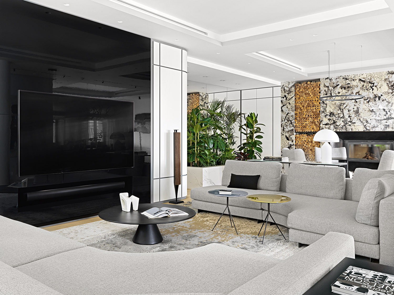 В планировочном решении автор проекта придерживалась ставшей уже классической схемы разделения пространства на общественную и приватную зоны. Гостиную разместили ближе ко входу, спальни, соответственно, — в глубине квартиры. В процессе перепланировки в гостиной возник тёмный аппендикс. Дизайнер предложила поставить здесь зеркальную стену и организовать зимний сад, на что хозяева с удовольствием согласились. «Проектом мы предусмотрели и тренажёрный зал (с большим зеркалом и балетным станком), и зимний сад, и комфортные рабочие места — заказчики видели свою городскую квартиру максимально комфортной, как в загородном доме. Но на тот момент мы ничего не знали про пандемию: проектирование объекта закончили до неё, а начало стройки пришлось как раз на длинный прошлогодний локдаун. Это было пожеланием владельцев, но впоследствии оказалось очень правильным решением: в условиях нестабильной ситуации у хозяев есть все условия, чтобы пережить домашнюю изоляцию безо всяких проблем», — замечает Оксана.