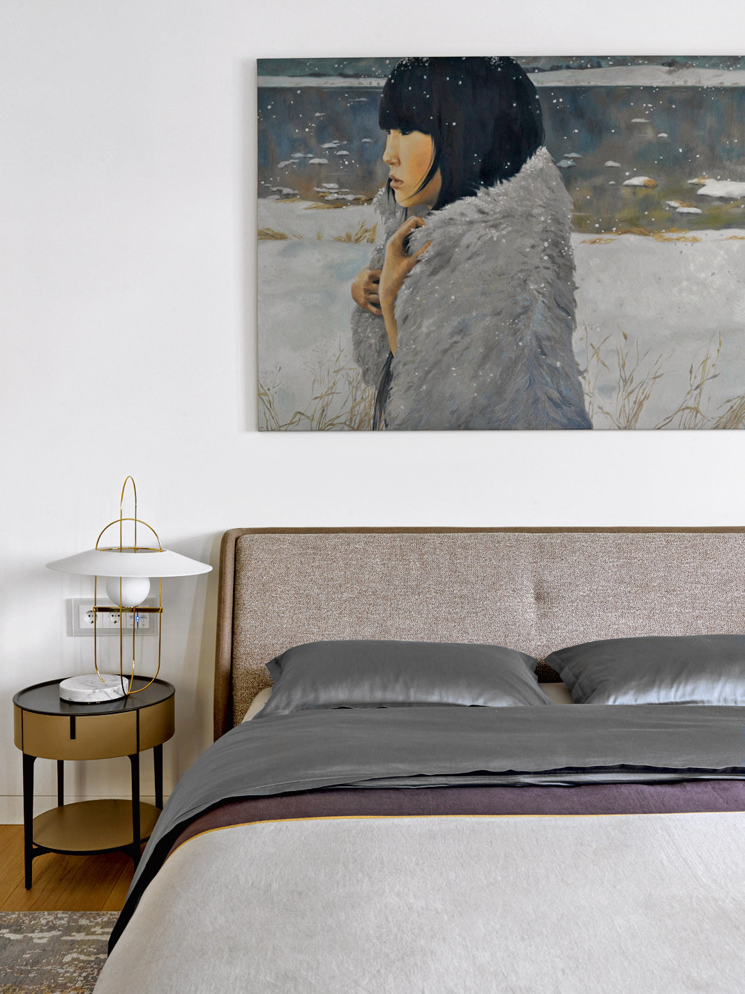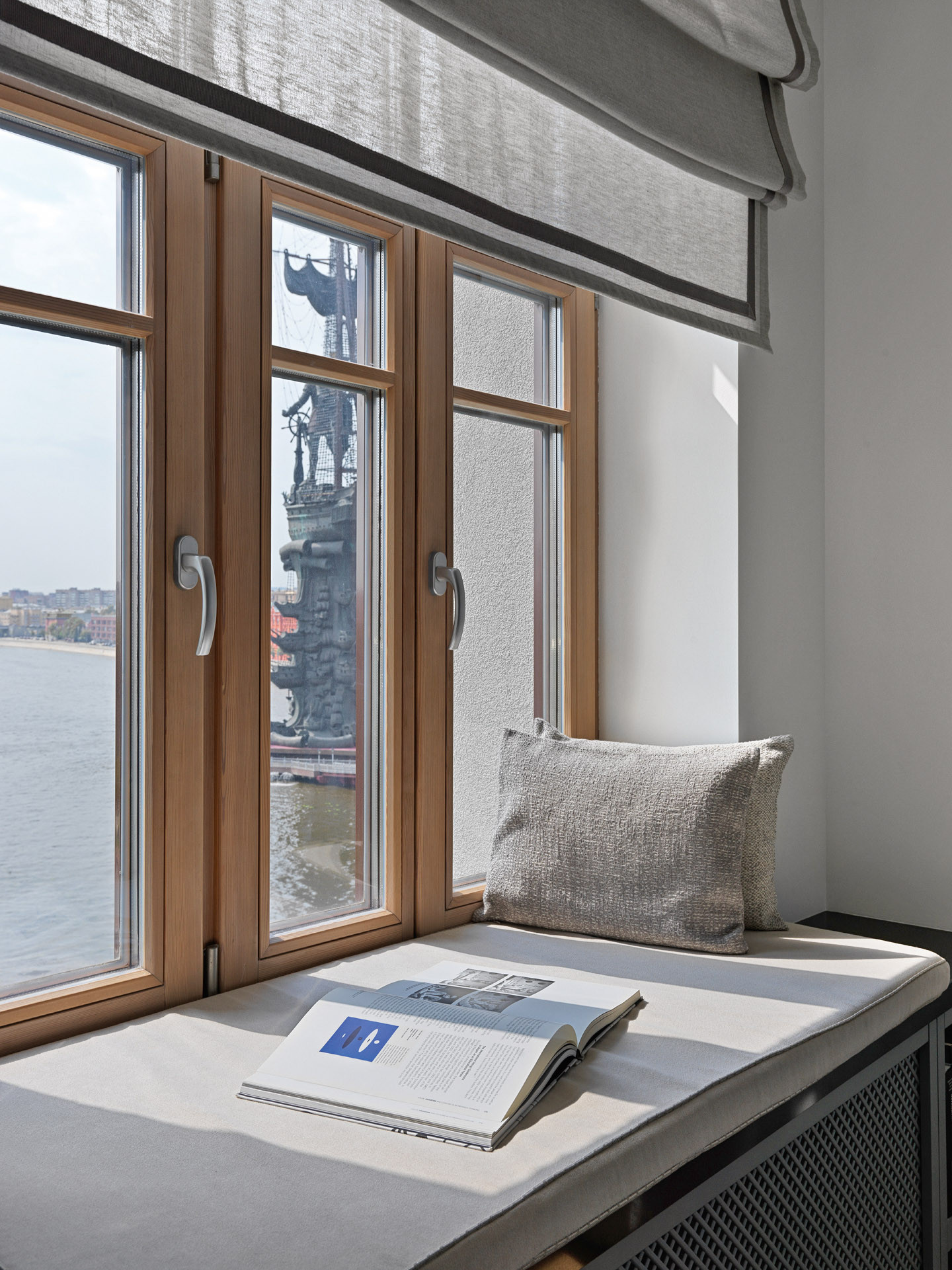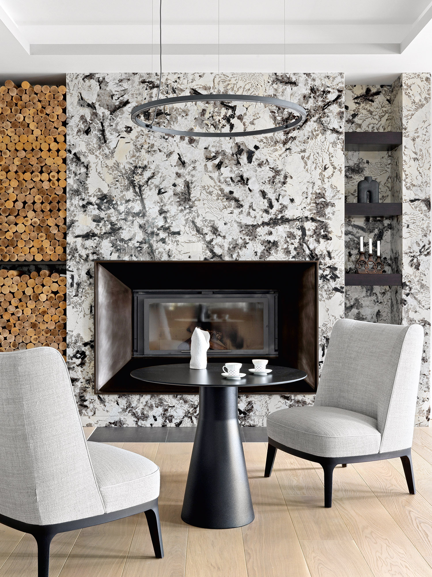 Заказчиками Оксаны Сальберг–Вачнадзе стала московская семья с двумя детьми. Они хотели получить интерьер в спокойных серых тонах с яркими акцентами. Ставку дизайнер сделала на сочетание разных материалов (натуральный камень, дерево, керамогранит) — одним словом, фактур в схожих оттенках из серо–бежевой палитры — и постаралась «не перегрузить» пространство. Оно и в самом деле масштабное, и тут можно было применить множество фишек. Но именно из–за размера оно потребовало лаконичных, крупных решений: таких, как камин в отделке из натурального гранита Alaska White, единый серый цвет стен, белые панели с серыми рустами, огромная лаковая панель за телевизором, позволяющая спрятать чёрный телевизор на чёрной панели, необыкновенной красоты слэб мрамора Macchia Vecchia в ванной комнате. Большое пространство объединяет отделка пола: для неё выбран максимально широкий формат доски (260 мм), который положили во всех жилых помещениях. Стиль интерьера Оксана называет современным минимализмом, который отличается от минимализма 2000–х годов разнообразием материалов, фактур, оттенков и отсутствием строгой геометрии.