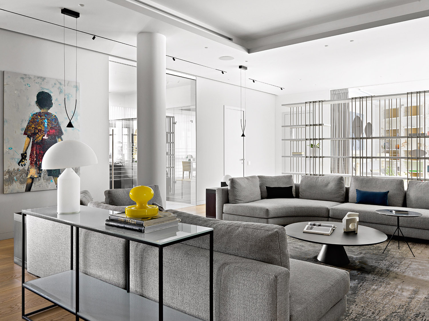 Зона гостиной зонирована с помощью двух больших диванов Minotti. На полу— широкая инженерная доска из натурального дуба. Журнальные столики, Baxter. Колонки, Bang & Olufsen. Ковёр, Dovlet house. На столике—скульптура Софии Карнукаевой. Настольная лампа, Oluce. Подушка, AtelierTati