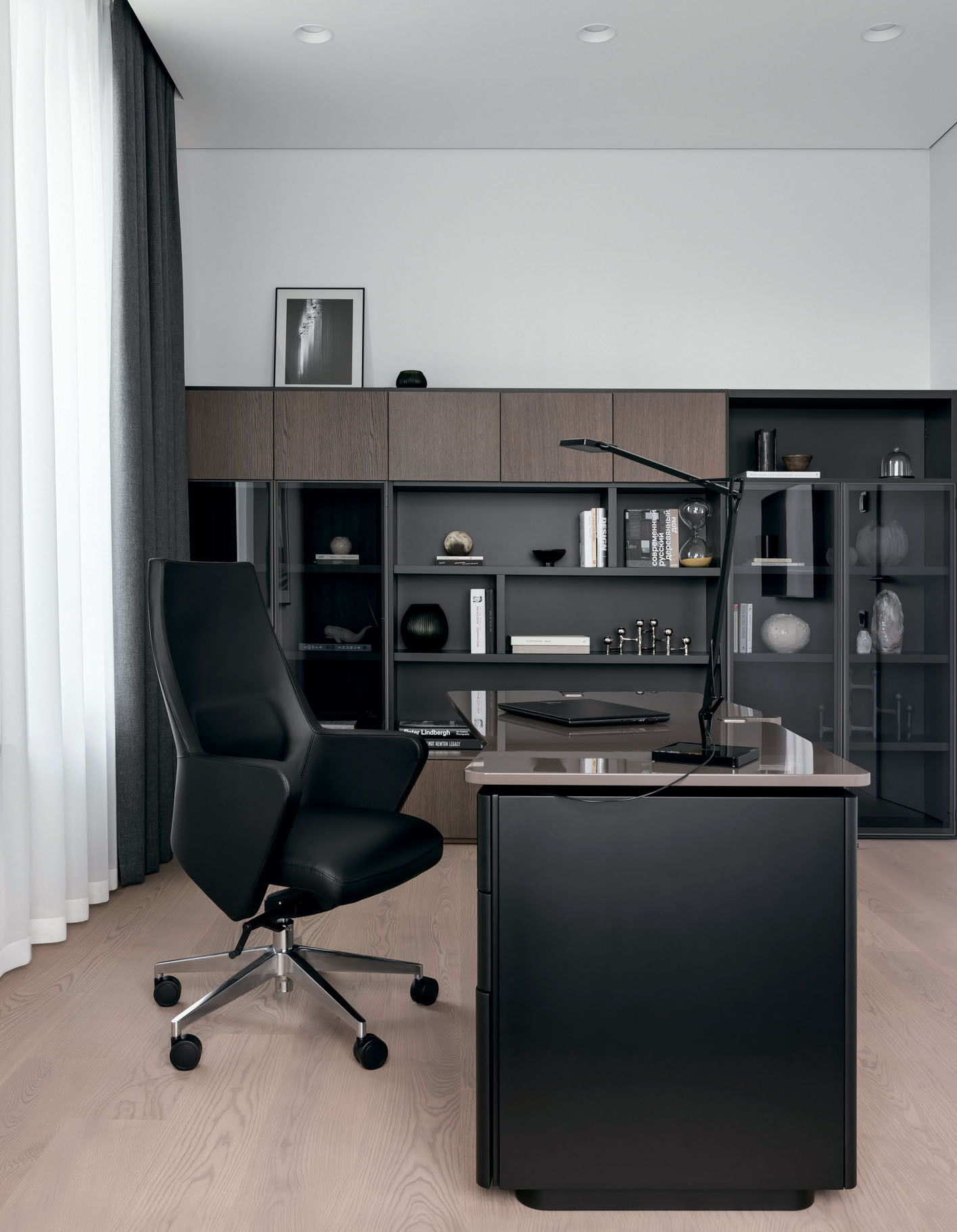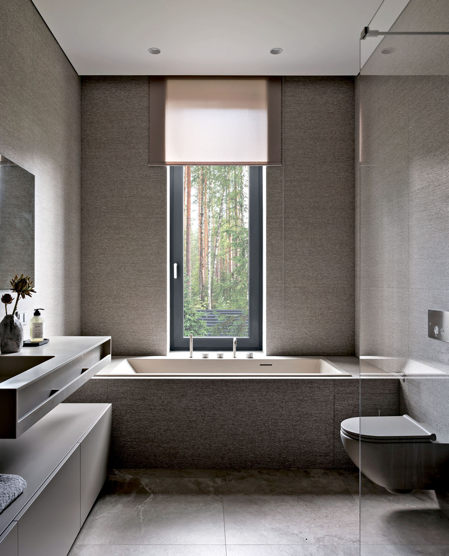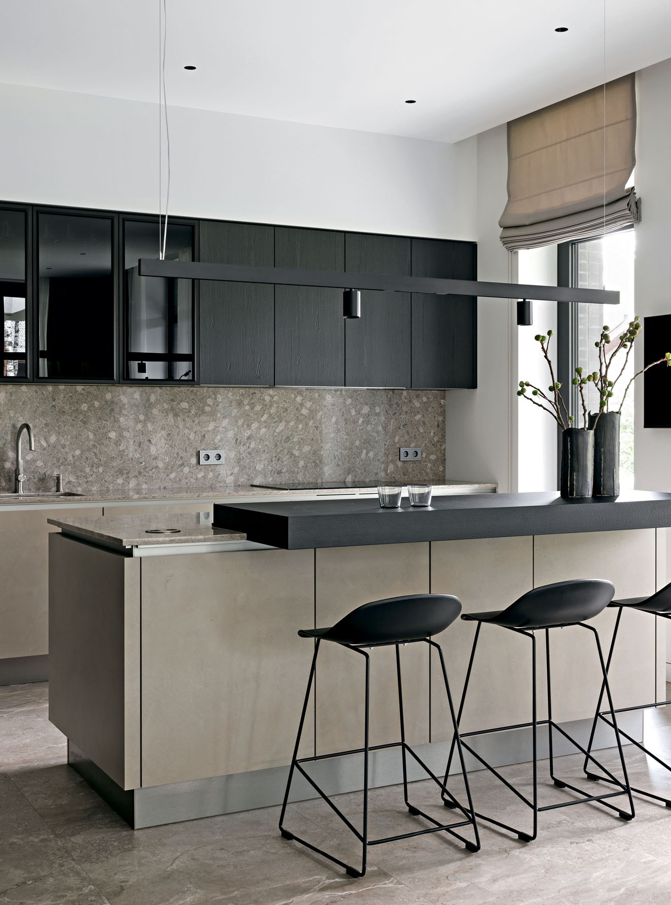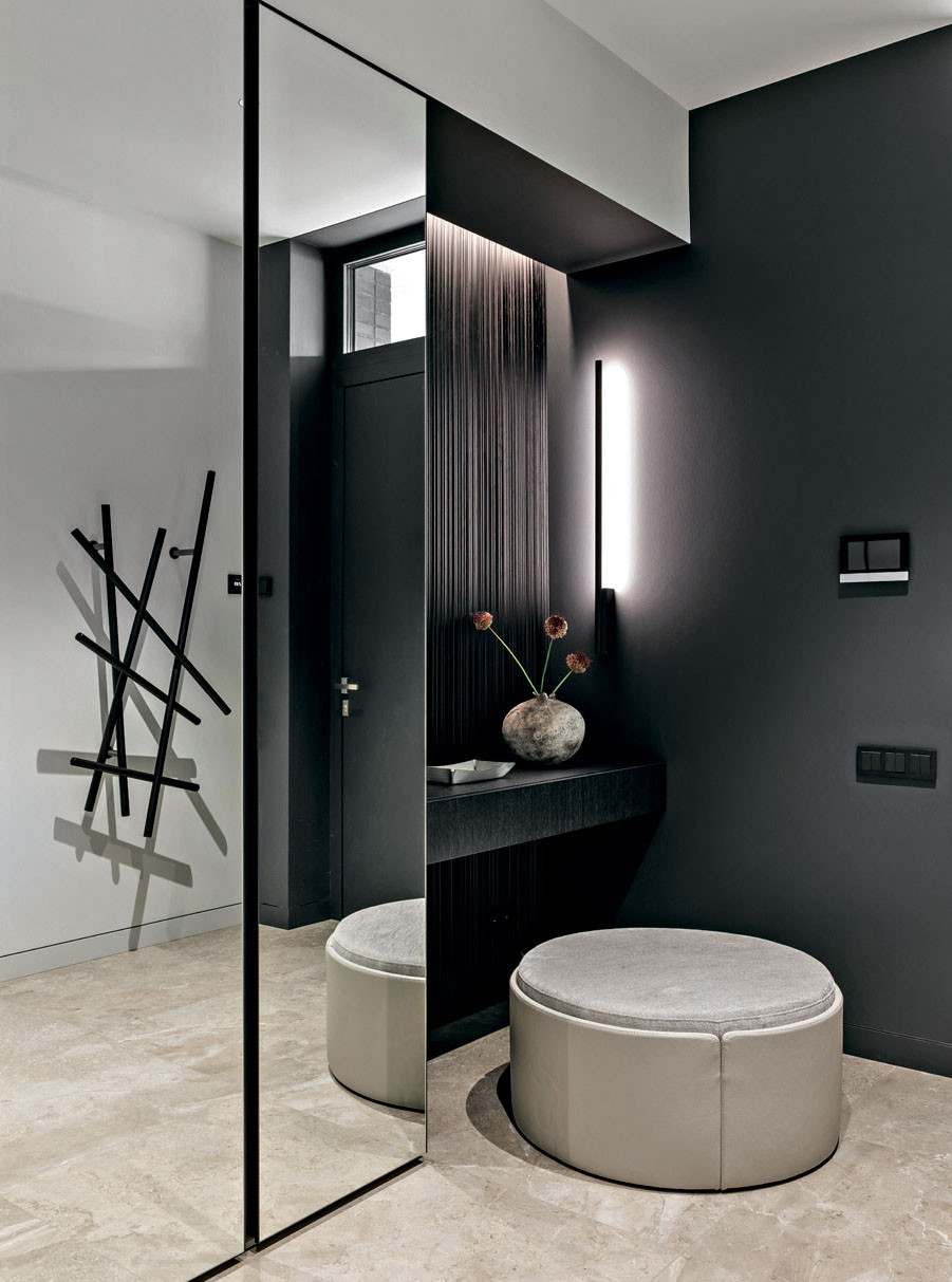 Дом состоит из нескольких основных архитектурных объемов, которые подчеркнуты при помощи разных материалов: черного кирпича, фасадной штукатурки оттенка серого питерского неба и брутальной коричнево-рыжей кортеновской стали в цвет стволов сосен. Отделки фасада перекликаются с окружающим ландшафтом и с интерьером. Так, основной объем стен также решен в светло-сером оттенке, а акценты расставлены при помощи мебели: она черная, из матового дерева. Например, одна часть фасадов кухни выполнена из темного обожженного дерева, а другая — с цементным текстурированным декором. Покрытие — натуральное, на фасады нанесено вручную. «Выбирая кухонный гарнитур, я учитывала сочетание качества, функциональности и дизайна, — объясняет архитектор, — и подходящую по всем характеристикам кухню нашла у NOLTE KÜCHEN. Кроме того, у этой фабрики богатые, интересные фактуры дерева и бетона, добавляющие глубины интерьеру». А еще Юлии нравится, что она реализовала в собственном доме один из самых своих любимых приемов: консоль как тип конструкции. Над террасой — большой, в три метра, консольный свес кровли, а в интерьере — лестница с консольными ступенями, визуально очень легкая. Эту лестницу создали на заказ по чертежам Юлии на столярном производстве «СЕНДЕГА». На вопрос, почему же в таком случае архитектор не стала сама проектировать и мебель для собственного дома, она отвечает, что проектировать надо, когда нужно то, чего пока не существует: «Мне же хотелось выбрать из того, что уже придумали дизайнеры: красивый стол, красивый диван. И в этом мне очень помогли наши петербургские салоны: POLLINI CASA — поставщик европейской мебели и сантехники, ALF ITALIA HOME — салон-представитель итальянского бренда ALF DAFRE». Но главный центр притяжения в интерьере — камин в отделке слэбом бразильского мрамора (камин изготовила на заказ компания «МАГИЯ КАМИНА»). Юлия так продумала конструкцию, что кажется, будто огромный тяжелый слэб парит в воздухе, и это завораживает. «Можно придумать что-то красивое, но обязательно нужно объяснить это решение с точки зрения функции, — объясняет она. —Такого подхода я придерживаюсь и в своей рабочей практике».