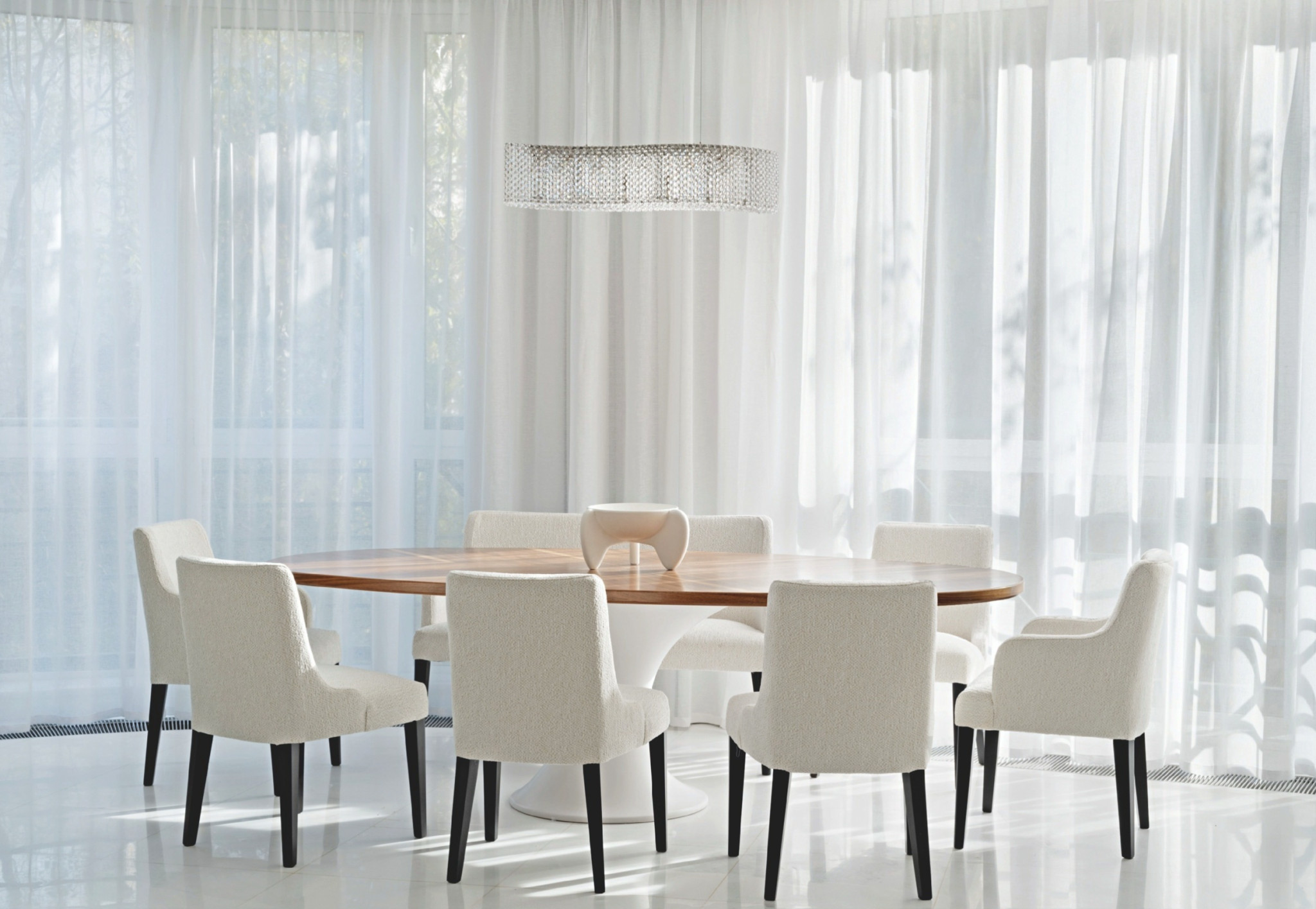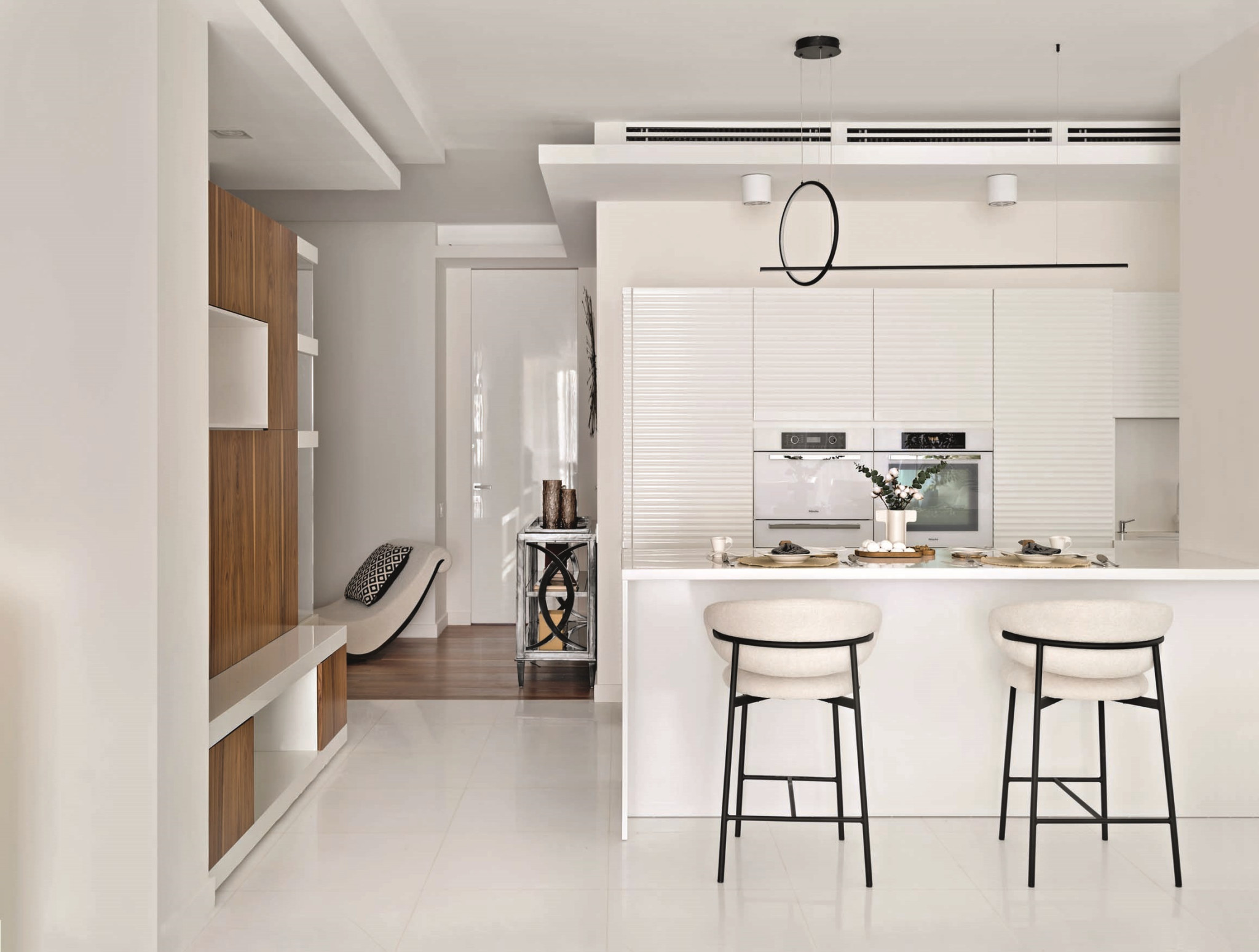 Гостиная — сердце всей квартиры. Благодаря панорамным окнам по всему периметру здесь много естественного света, а нежная молочно-белая гамма поддерживает эффект легкости и воздушности. Пространство удачно зонирует сама форма помещения — в центре скругленного эркера разместили обеденную зону с овальным столом, где хозяева могут собираться вместе с семьей и гостями. С другой стороны — небольшой остров отделяет зону кухни. Ритм всей общей зоне задает акцентная ТВ-стена из травертина с геометричным рисунком.