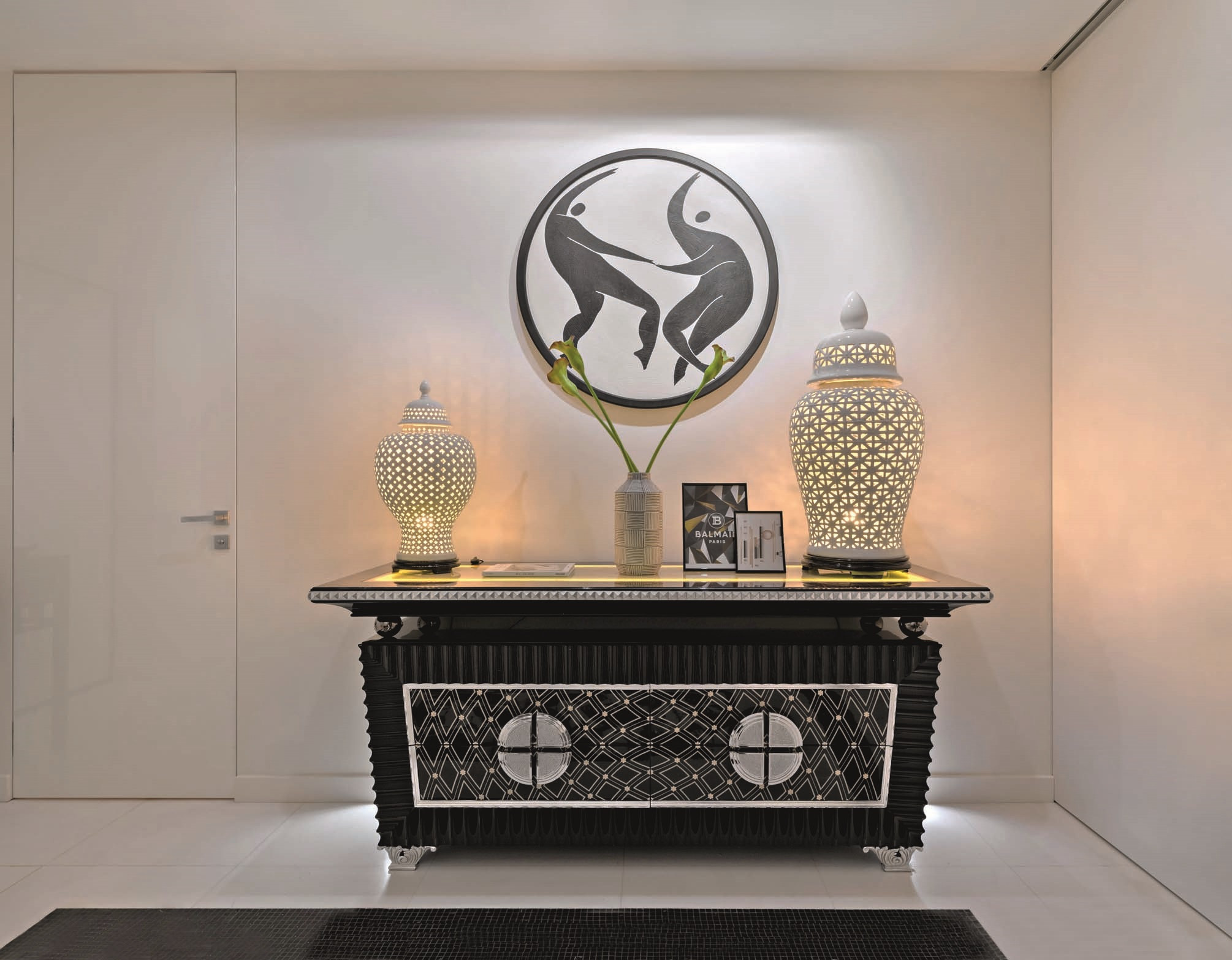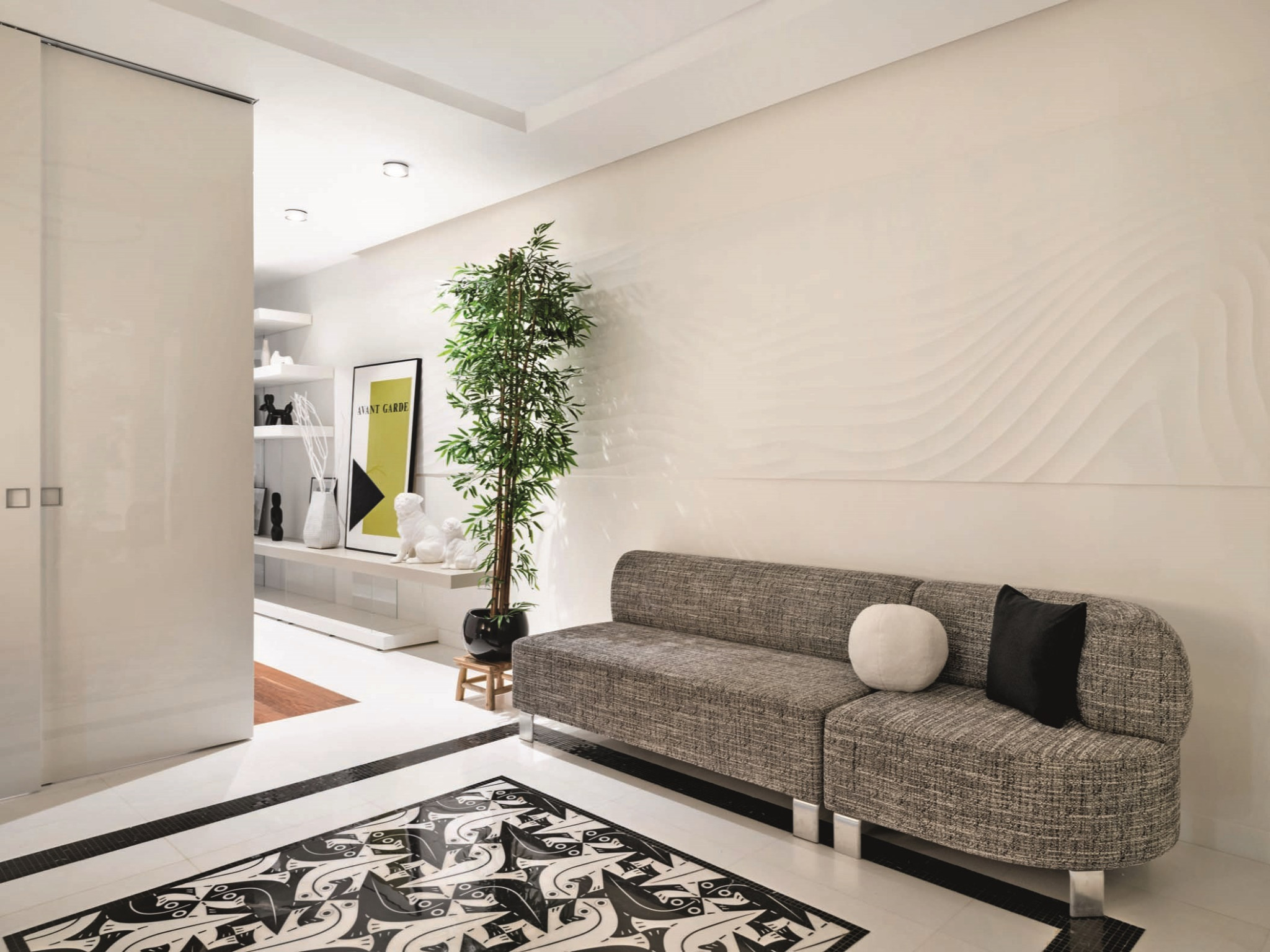 Квартира расположена в клубном доме премиум-класса, в самом сердце столицы, на Патриарших прудах. Заказчики — прогрессивная пара с космополитичными взглядами на дизайн, поэтому команде бюро AlexaBrattdesign во главе с Алексией Братушковой предстояло органично соединить несколько стилевых направлений. Отправной точкой проекта стал авангард — его черты считываются в архитектуре дома. «Для меня важно подчеркнуть связь между интерьером и экстерьером, — говорит Алексия Братушкова. — Так, в этом проекте фасад дома облицован мраморированным известняком молочного цвета — тот же известняк мы добавили в композицию из геометричных элементов в зоне гостиной. А оттенки зеленого в кабинете и санузлах перекликаются с цветом французских балкончиков на фасаде дома». Изначальная планировка квартиры отвечала всем пожеланиям заказчиков. Просторный холл плавно перетекает в общее пространство гостиной, столовой и кухни. В нем же обустроили уютную зону библиотеки. В приватном блоке — хозяйская спальня со своим санузлом и кабинет, который может в будущем послужить и гостевой, и детской. В основу интерьерной концепции легло творчество нидерландского художника-графика Маурица Корнелиса Эшера. Эксперименты с формой, перспективой и логикой пространства в его работах на стыке сюрреализма и поп-арта отражают характер проекта — многослойный, динамичный, построенный на контрастах. К гравюрам Эшера отсылает геометричное панно из нескольких сортов мрамора в холле, его же литографии украшают стены кабинета.