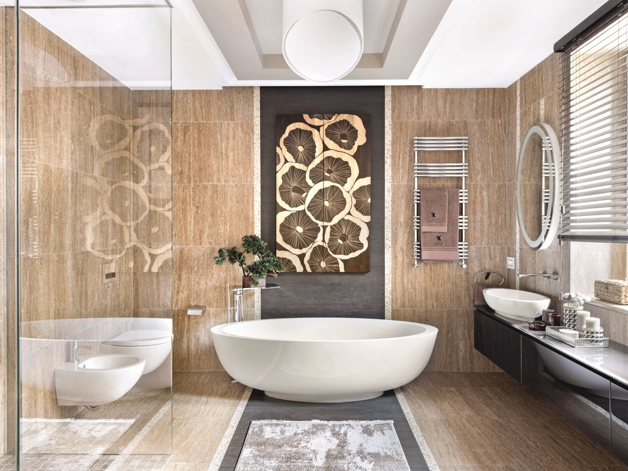 Эксперименты с зонированием продолжаются и в приватном блоке. В самом центре спальни — эффектная круглая кровать от Ivano Redaelli. Она визуально разделяет пространство и задает ритм другим элементам мебели — мотив круга повторяется и в форме светильников, и в авангардном рисунке комода. «Создавая интерьеры, я стараюсь опираться не на тренды, а на характер и пожелания заказчиков, их личные истории. В этом проекте мне удалось воплотить идею смешения стилей, но спокойного и гармоничного. Так хозяева квартиры смогут легко добавлять в интерьер детали, наполнять свой дом новыми смыслами, при этом общая концепция не нарушится», — заключает Алексия.