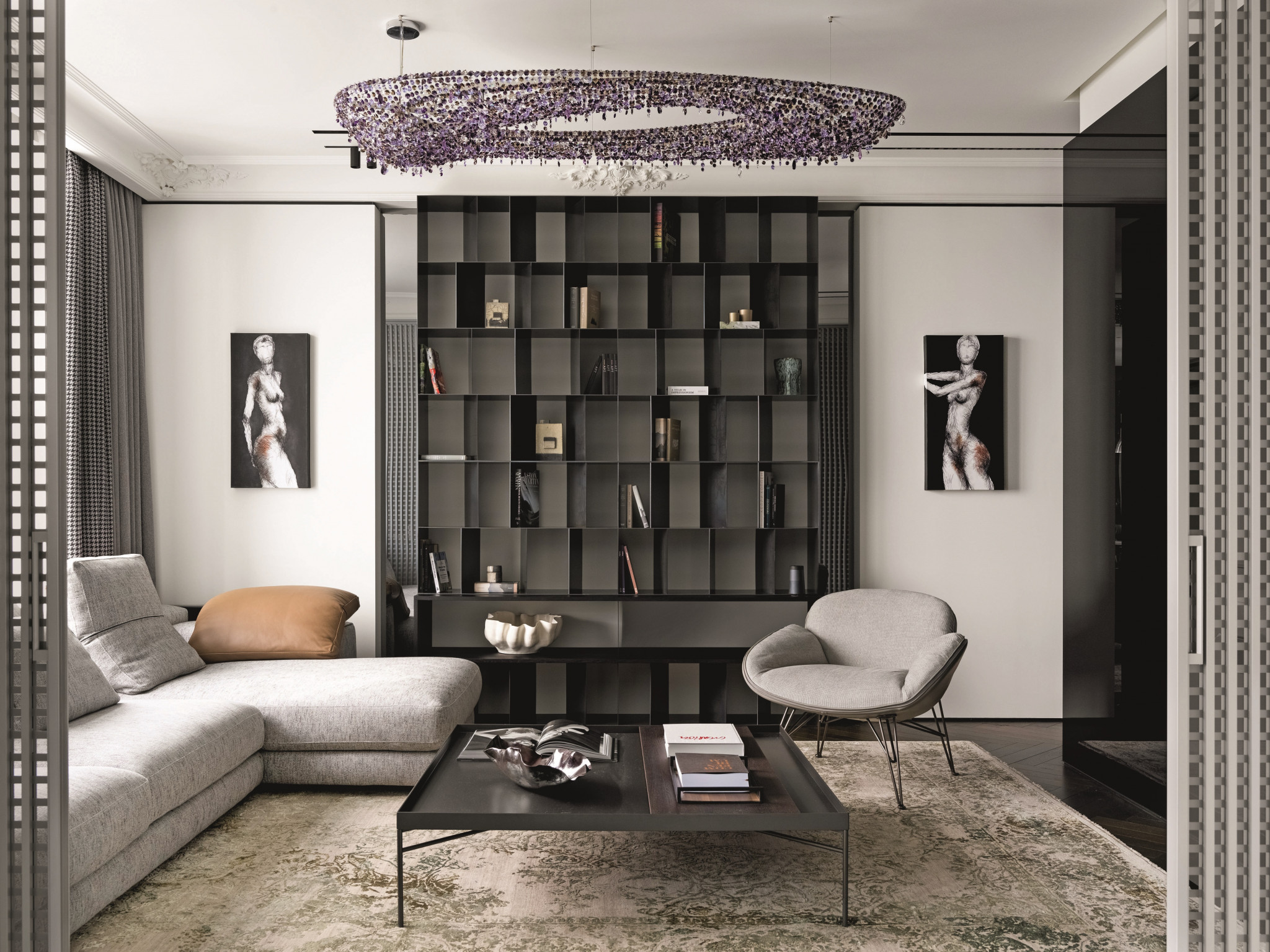Доминантой в гостиной служит угловой диван Atlas, Arketipo. А оригинальным интерьерным элементом стал стеллаж из воронёной стали, выполненный по авторским чертежам. Его грани расположены в хаотичном порядке и развёрнуты к зрителю под разными углами, что позволяет конструкции выглядеть самодостаточной и без декоративного наполнения. В центре гостиной—объёмная люстра из цветных кристаллов богемского стекла Artica Bohemian от Manooi, кропотливо собранная и установленная мастерами компании HomeART | Interior Showroom. Картины, Franc¸ois Sahuc, Carré d’Artistes. На стеллаже—керамика, Лиза Федотова, LF Ceramics. Портьеры, компания «Придворный портной»