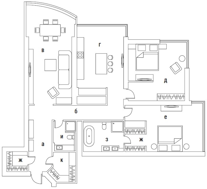 а) прихожая б) холл в) гостиная–столовая г) кухня д) гостевая комната е) спальня хозяина ж) гардеробные з) ванная комната и) гостевой санузел к) постирочная