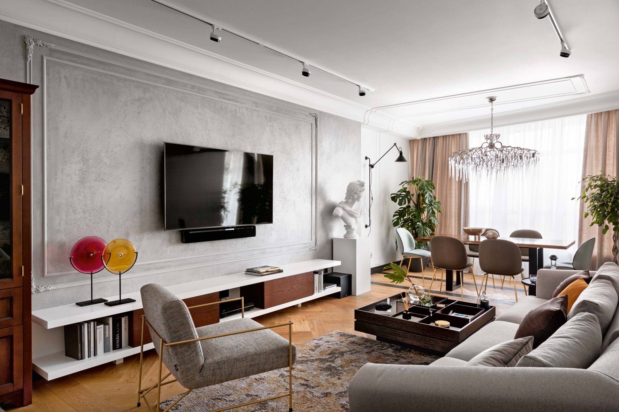 Общий вид гостиной–столовой. Диван, кресло, журнальный столик, Ditre Italia. Люстра, Brand Van Egmond. Стулья, Gubi. Бра, DCW. Потолочные светильники, Wever&Ducré. Декоративные круги, Natuzzi