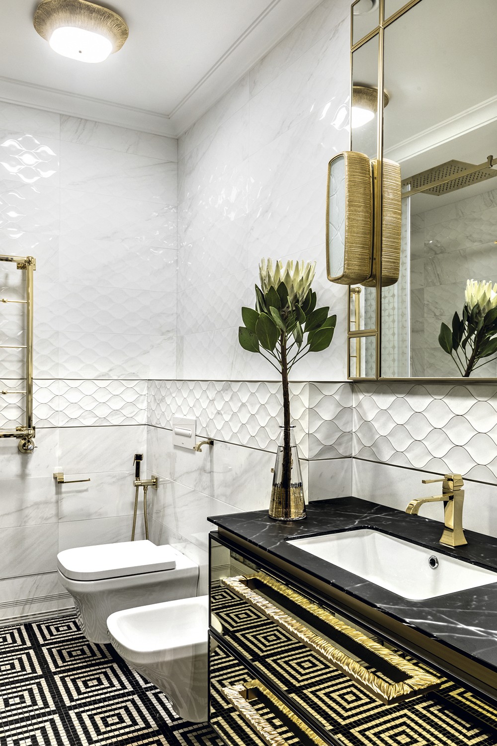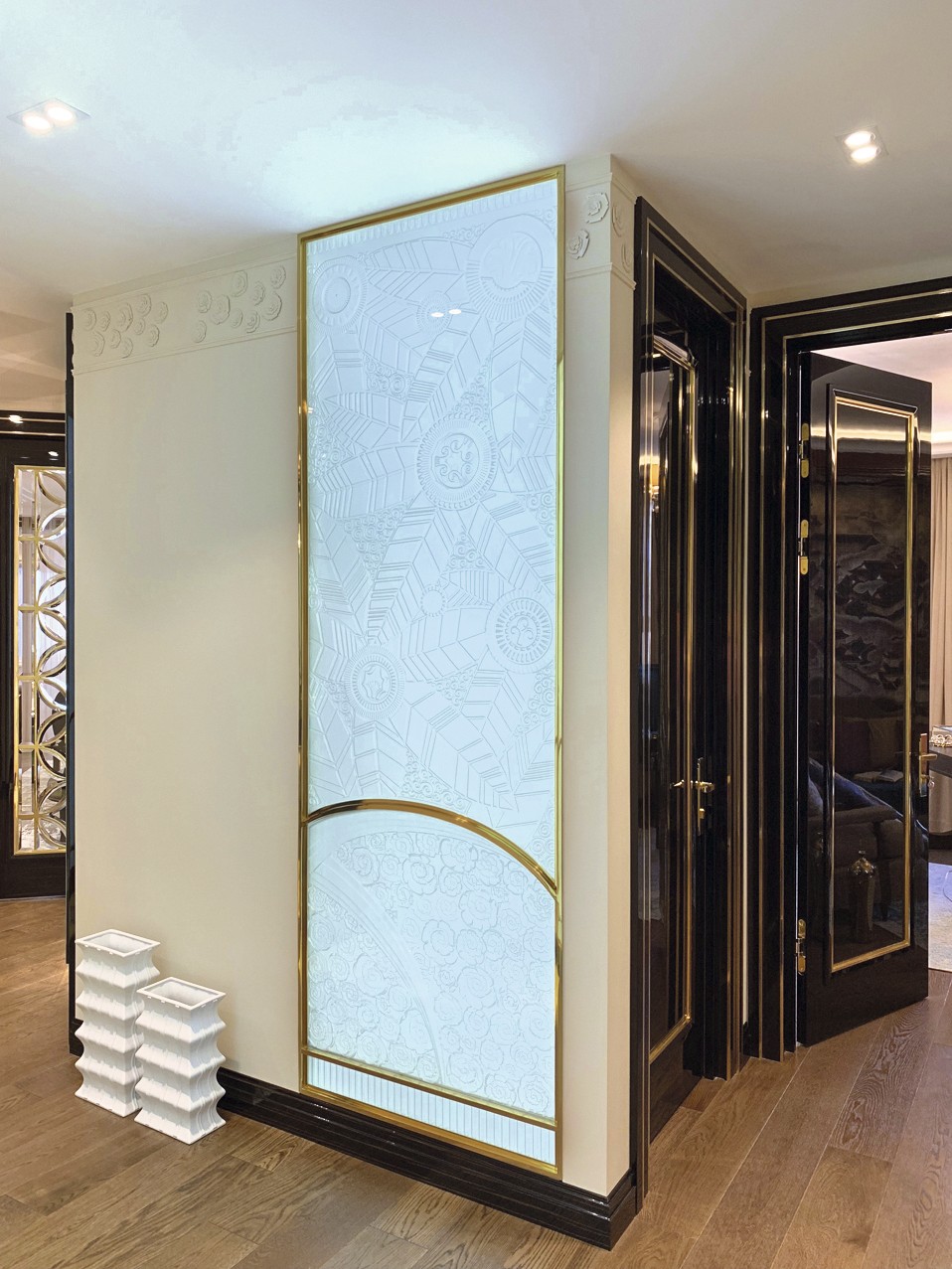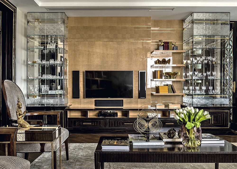 Автор проекта Екатерина Лебедева: «Мои заказчики, обладающие утончённым вкусом, пожелали создать интерьер без оглядки на модные тенденции. Передо мной стояла задача спроектировать «родовое гнездо», интерьер, сочетающий дворцовую роскошь и современные интеллектуальные технологии. Меня вдохновил образ резной китайской шкатулки, а ключом к решению интерьера стал стиль ар–деко, в котором шик и роскошь азиатской культуры переплетаются с элементами неоклассики и функционализма»