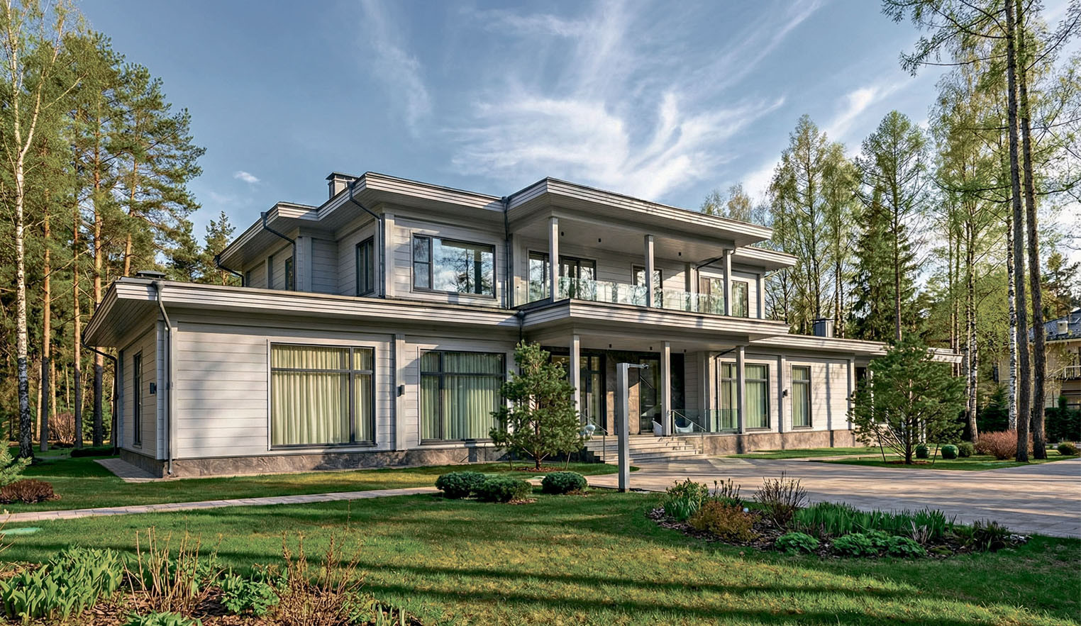 Для строительства был выбран лесной участок в небольшом приватном поселке рядом с Москвой, и непростой задачей оказалось вписать объем дома между крупными деревьями. В итоге он гармонично смотрится в природном окружении и при довольно внушительной общей площади не кажется слишком большим. Протяженный первый этаж и небольшой второй, пологие, почти плоские скаты кровель, завершающиеся сильно выступающими свесами-карнизами, огромные панорамные окна, стеклянные ограждения балконов и террас, светло-серые Д поверхности деревянных стен в сочетании с темно-серым цветом природного камня на фасадах — элегантное архитектурное решение. Казалось бы, достаточно создать в интерьере красивый рефрен фасадам — и всё сложится. Но у хозяев был совсем другой запрос. Они хотели, чтобы пространство дома не выглядело «деревянным». Свой будущий интерьер они видели лаконичным, светлым, в духе современной классики. «Применение безусадочного бруса из северной сосны позволило спрятать за декоративными элементами свойственные деревянному дому конструктивные узлы и детали, — объясняет архитектор Светлана Веселова («АРХИВУД»). — Эти приемы подчеркивают «недеревянный» характер интерьера, но при этом сохраняется тепло природного материала».