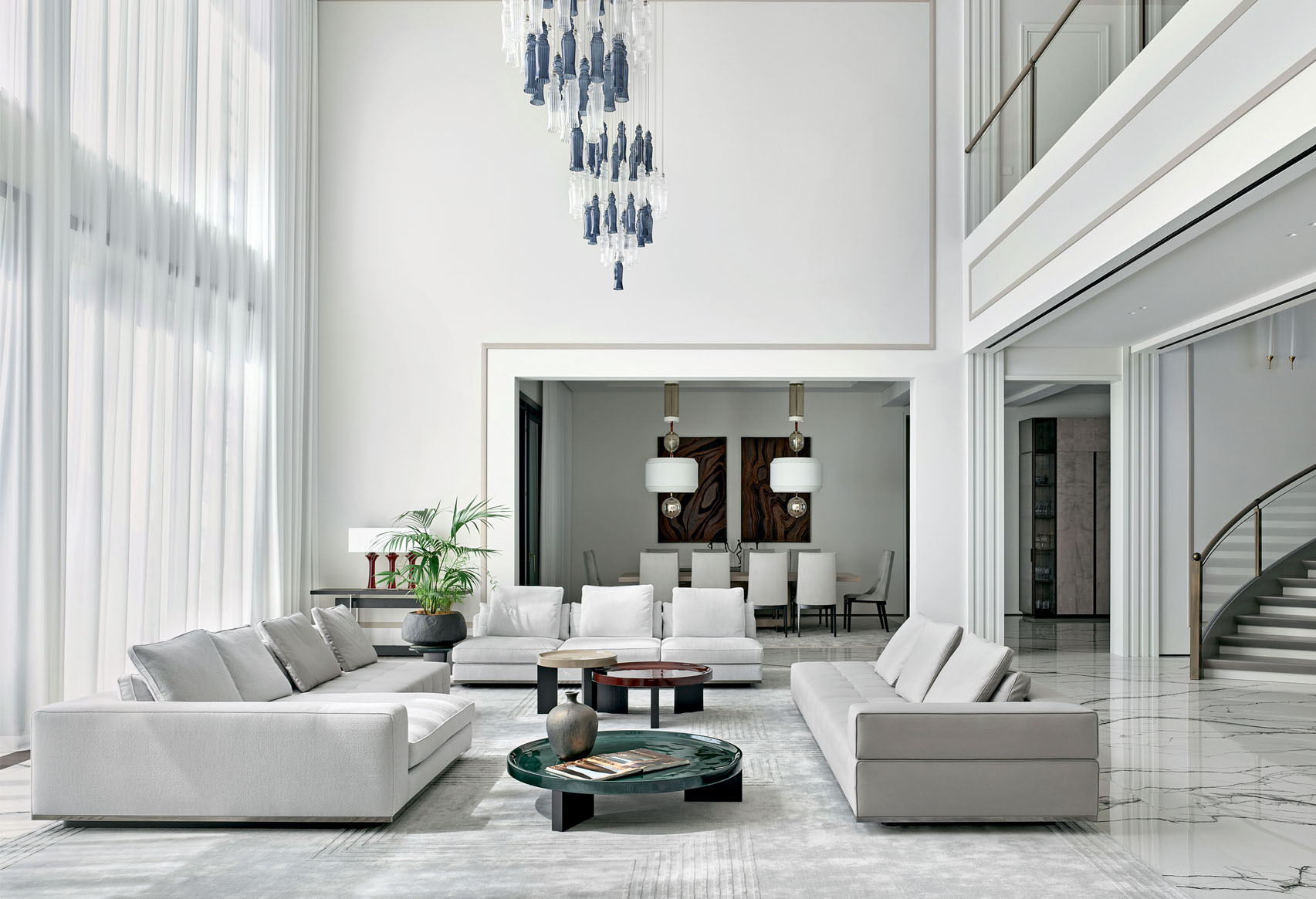 Двусветное пространство гостиной. Диваны, журнальные столики, дизайн Rodolfo Dordoni, Minotti. Люстра, дизайн Roberta Vitadello, Stefano Traverso, ITALAMP. Ковер изготовлен на заказ по эскизу Елены Лукинской компанией KULTURAKOVROV