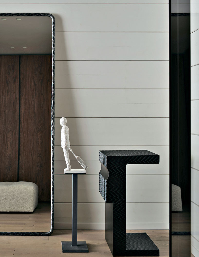 Фрагмент холла второго этажа. Здесь, как и в главной кухне, сохраняется легкая графика бруса, но под краской текстура дерева не читается, как того и хотела хозяйка. Скульптура, Егор Плотников