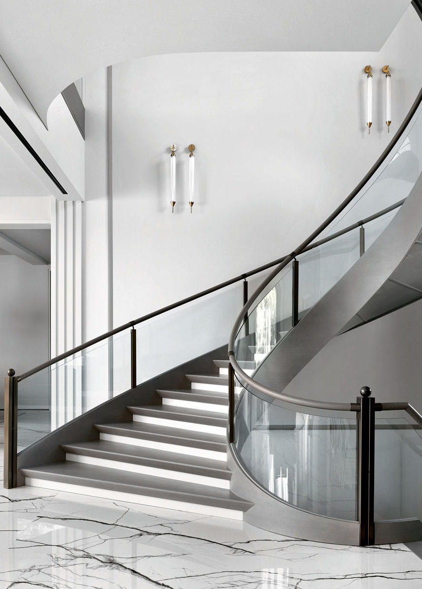 «Двухмаршевая винтовая лестница — сложная по конструктиву и реализации, — рассказывает Елена Лукинская. — Изначально планировалось сплошное моллированное ограждение (из гнутого стекла) с деревянными перилами. Однако, чтобы придать лестнице более парадный вид, было принято решение добавить латунные балясины и сделать эффектные кожаные перила. Это усложнило процесс реализации: необходимо было предусмотреть скрытые стыковочные элементы деталей»