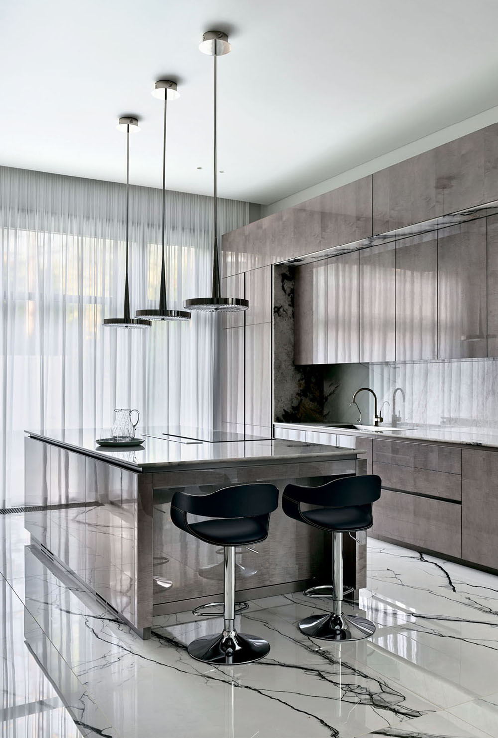 Зона кухни на первом этаже. Кухня изготовлена на заказ российской компанией ATTRIBUTE. Светильники над островом, дизайн Studio Mamo, ITALAMP