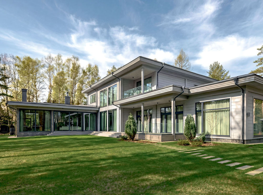В светлом элегантном интерьере семейной резиденции ничто не напоминает о том, что дом построен из сосны — это возможно благодаря современным технологиям