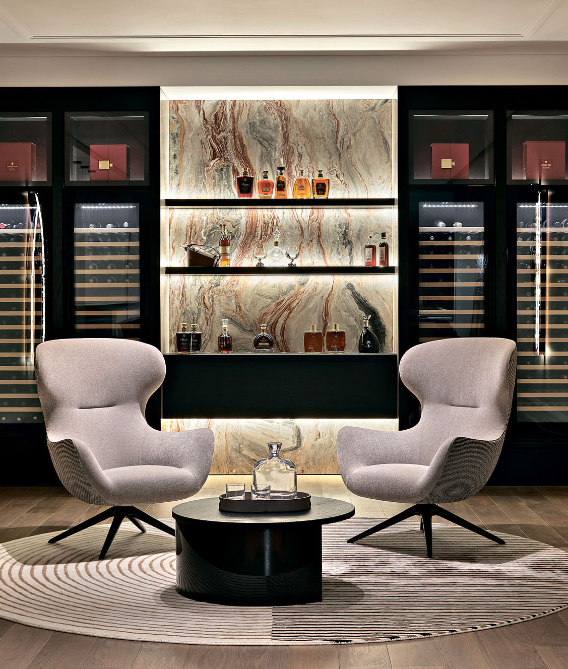 Цокольный этаж — территория развлечений. Здесь спроектировали домашний кинотеатр, также есть бильярд, зона для игры в настольный теннис, бар, винотека и кухня. Два кресла у столика в баре, Poliform
