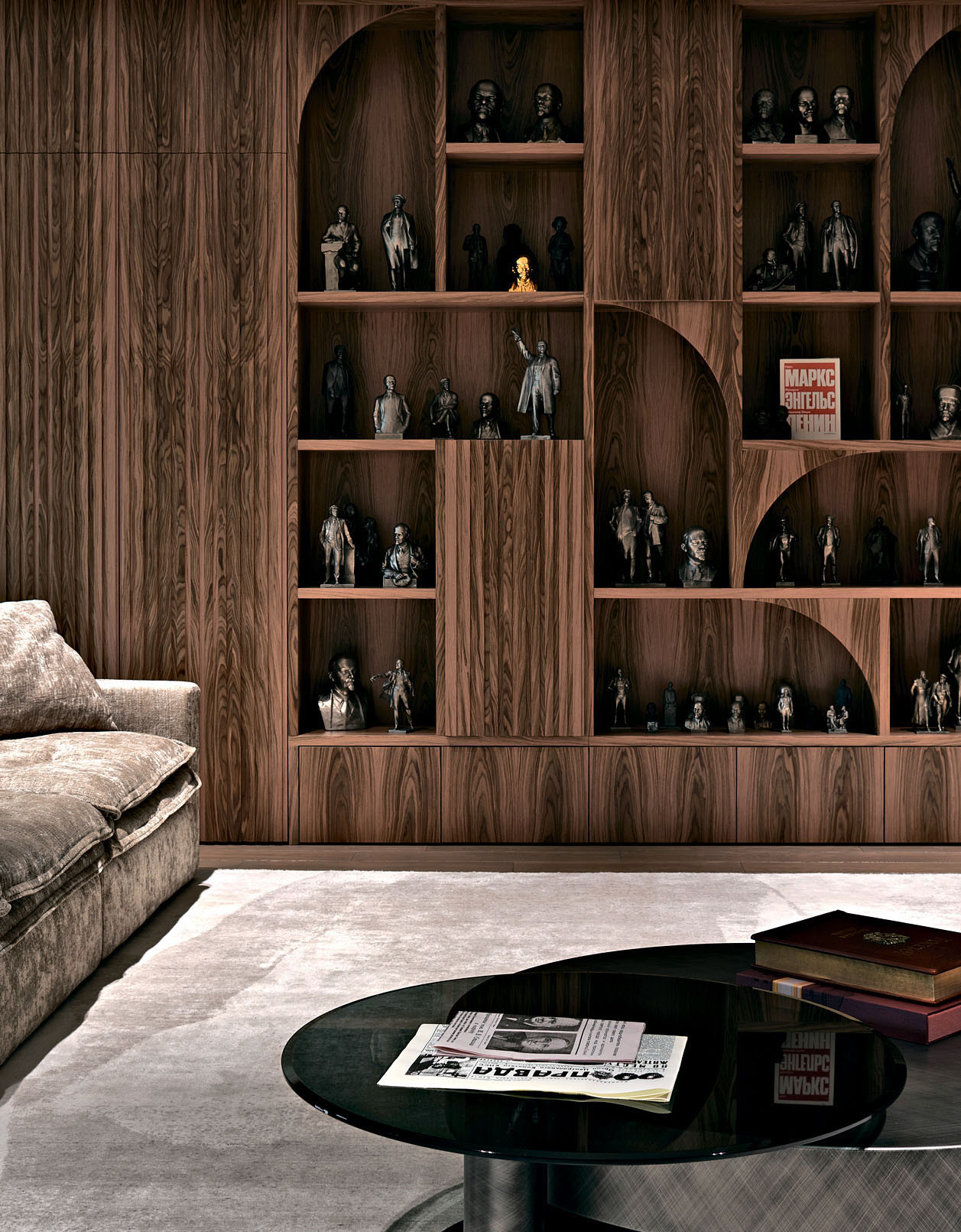 В специально спроектированной стеллажной системе на цокольном этаже располагается обширная коллекция статуэток с изображением Ленина из собрания хозяев