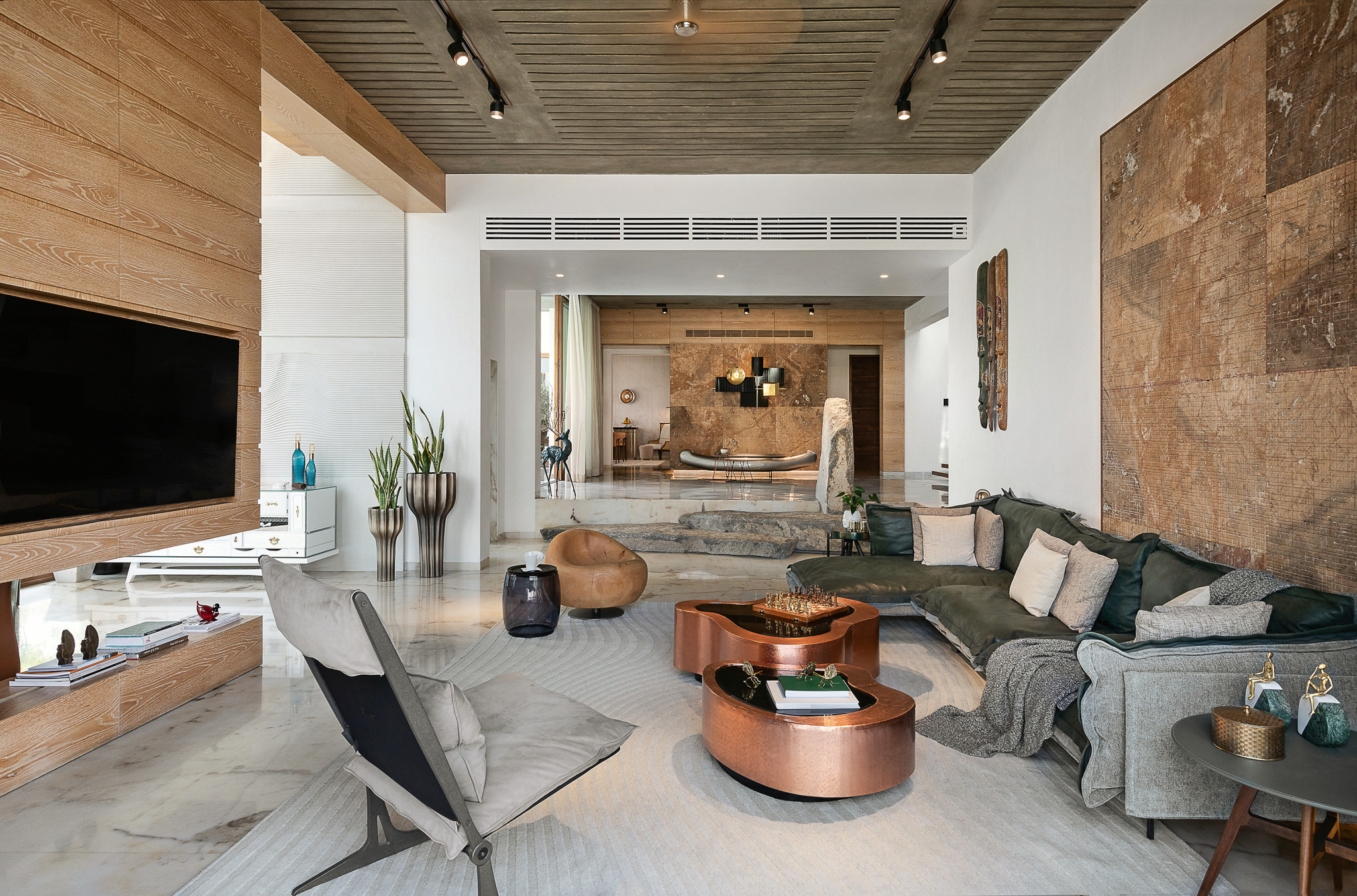 Особняк принадлежит самим архитекторам, поэтому препон для экспериментов не было никаких. Рупана и Нируп Редди (NA Architects) решили построить дом, в котором формат eco green сочетался бы с современным гламуром, доказав тем самым, что эти стили далеко не антагонисты. Сложная архитектура постройки призвана наполнить комнаты естественным светом. Внутреннюю планировку архитекторы выстроили исходя из окружающего дом ландшафта, чтобы по возможности в каждом помещении были панорамные окна с видом. «Зелёный» фон становится важным декоративным элементом, на равных правах с предметами искусства и дизайнерской обстановкой участвующим в создании образа дома. Необработанный бетон, древесина тёплых тонов, множество растений сочетаются в интерьере дома с отделкой мрамором и ониксом, броскими элементами декора и мебелью под глянцевым лаком. С одной стороны, дом отвечает всем канонам ответственного потребления: энергию вырабатывают солнечные батареи,