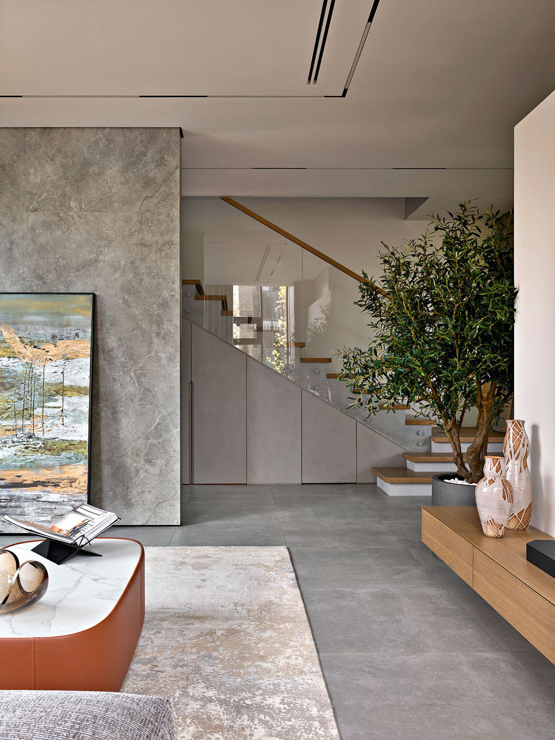 «Главная идея проекта — объединение интерьера с экстерьером, — рассказывает архитектор Антонина Синчугова. — Так как этот таунхаус угловой, здесь много панорамных окон, впускающих естественный свет и фокусирующих взгляд на потрясающей картине за окнами. Эти виды — неотъемлемая часть интерьера, в то же время — его обрамление». А поскольку пейзаж большую часть года яркий и активный, цветовую палитру интерьера решили строить на умиротворяющих природных оттенках серого. Весной, летом и осенью они успокаивают бушующие за окном краски, зимой органично вписываются в монохромную природную палитру и всегда гармонично сочетаются с медно-рыжими акцентами в интерьере.