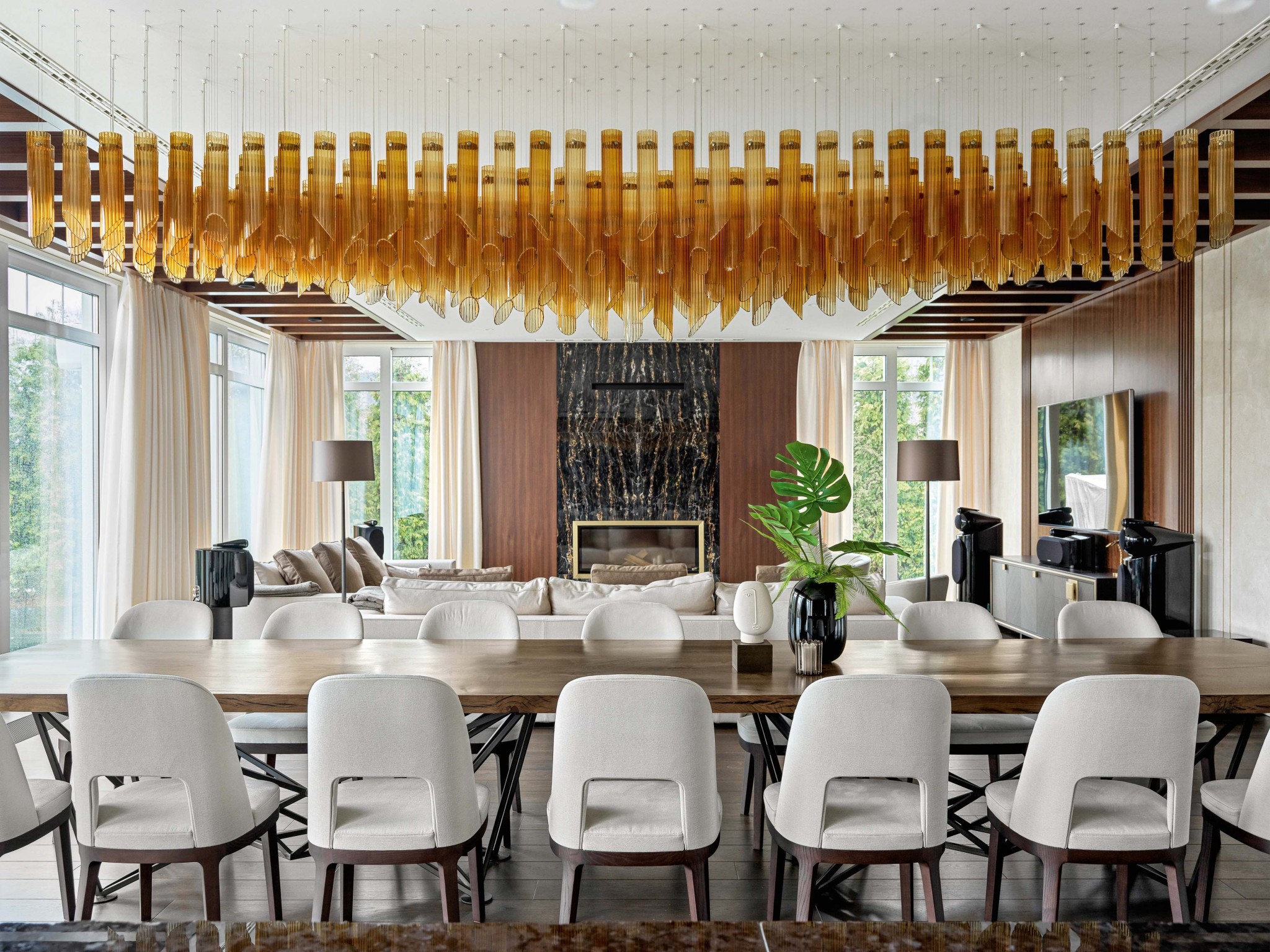 Заказчик поручил Елене разработать интерьер гостевого дома, основной функционал которого планировался как ивент–пространство. Именно поэтому большую часть площади архитектор отдала под просторную общественную зону. Помимо гостиной с мягкой диванной группой здесь есть столовая с большим столом на шестнадцать человек, кухня с казаном, настоящим дровяным мангалом и даже тандыром. Раздвижные окна–перегородки в пол с трёх сторон помещения наполняют пространство светом и при необходимости превращают гостиную в уличную беседку, откуда можно выйти на открытую террасу у воды. «Основные центры притяжения в доме — два «очага»: камин и мангал, — поясняет автор проекта. — Мы расположили их напротив друг друга, на фронтальных стенах, подчеркнув таким образом их главенствующее положение. Обеденный стол — ещё одна значимая деталь в интерьере. Он выполнен по нашему проекту. Для его создания использовали спилы из ствола карагача длиной более пяти метров. Как оказалось, ствол такой длины — большая редкость, и мы его искали почти полгода».