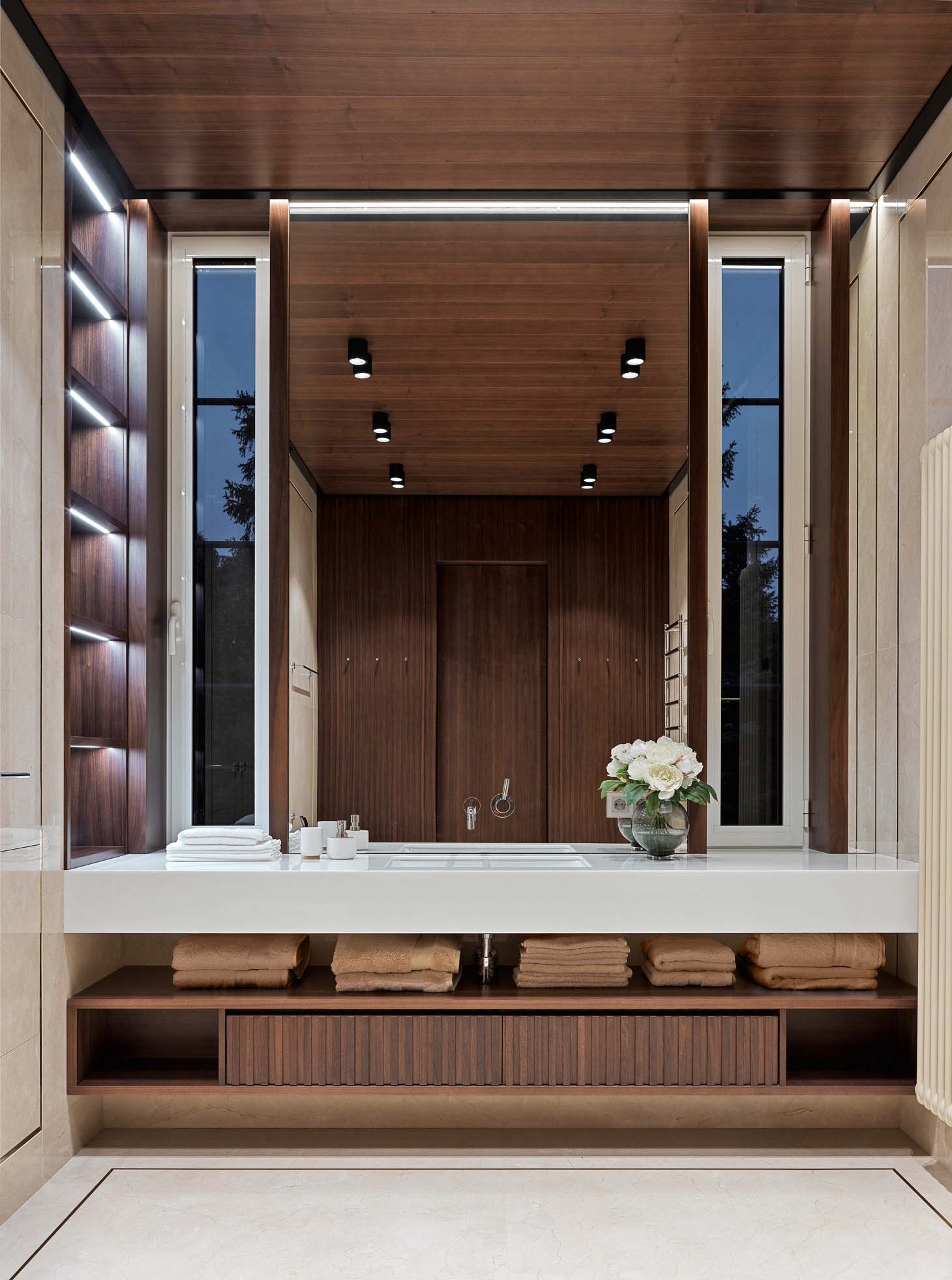 В оформлении использованы дорогие, статусные марки мебели, натуральные, природные материалы и приятные фактуры, которые создают, с одной стороны, атмосферу отдыха, а с другой — динамичную среду для домашних праздников. Пол в гостиной и спальне выложен паркетной доской из тонированного дуба, в холле и коридоре —мрамором с инкрустацией из латуни. Стены декорированы деревянными буазери и рельефными наборными панелями из мрамора, а потолок — деревянными панелями и балками. Пристальное внимание архитектор уделила тактильности предметов. Это мягкие и уютные обивки мебели, ковры, тёплые поверхности дерева, к которым приятно прикасаться. В свою очередь натуральный гранит с колотым краем и холодные гладкие поверхности мрамора привносят в интерьер эффектный контраст. Стилистика пространства в меру современная с налётом лоска и респектабельности выбрана не случайно, ведь по заданию заказчика гостевой дом должен был стать логическим продолжением основного дома как во внешнем облике, так и во внутреннем. «У хозяев довольно часто бывают гости: партнёры по бизнесу, медийные личности,— замечает Елена.— Шумные и весёлые застолья могут помешать маленьким детям, поэтому заказчик решил создать отдельное пространство, позволяющее отдыхать и детям, и взрослым, не мешая друг другу. Даже несмотря на некую функциональную легкомысленность дома, мы старались сделать всё, чтобы интерьер соответствовал статусу хозяев».