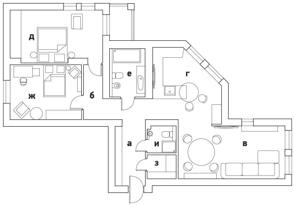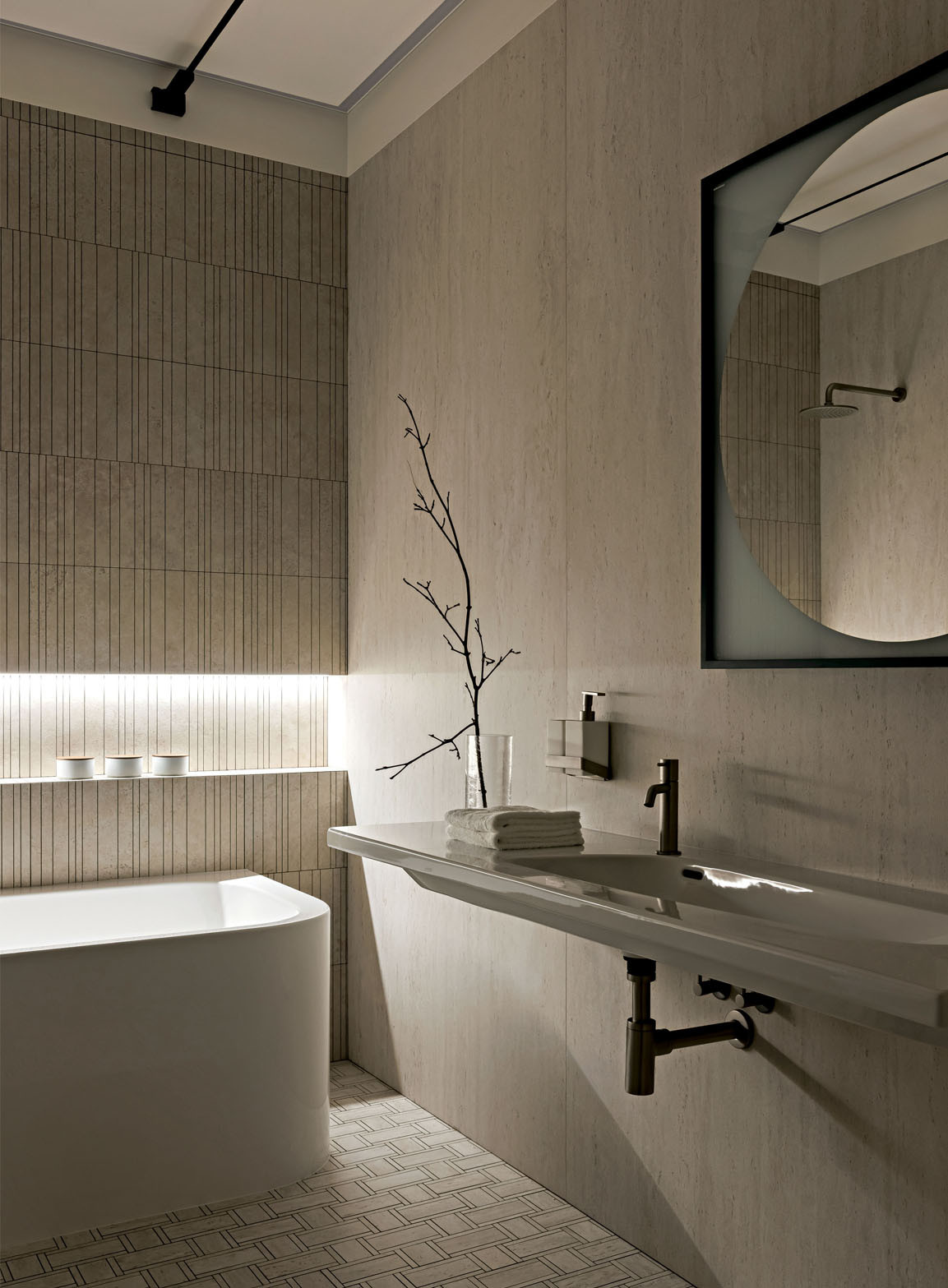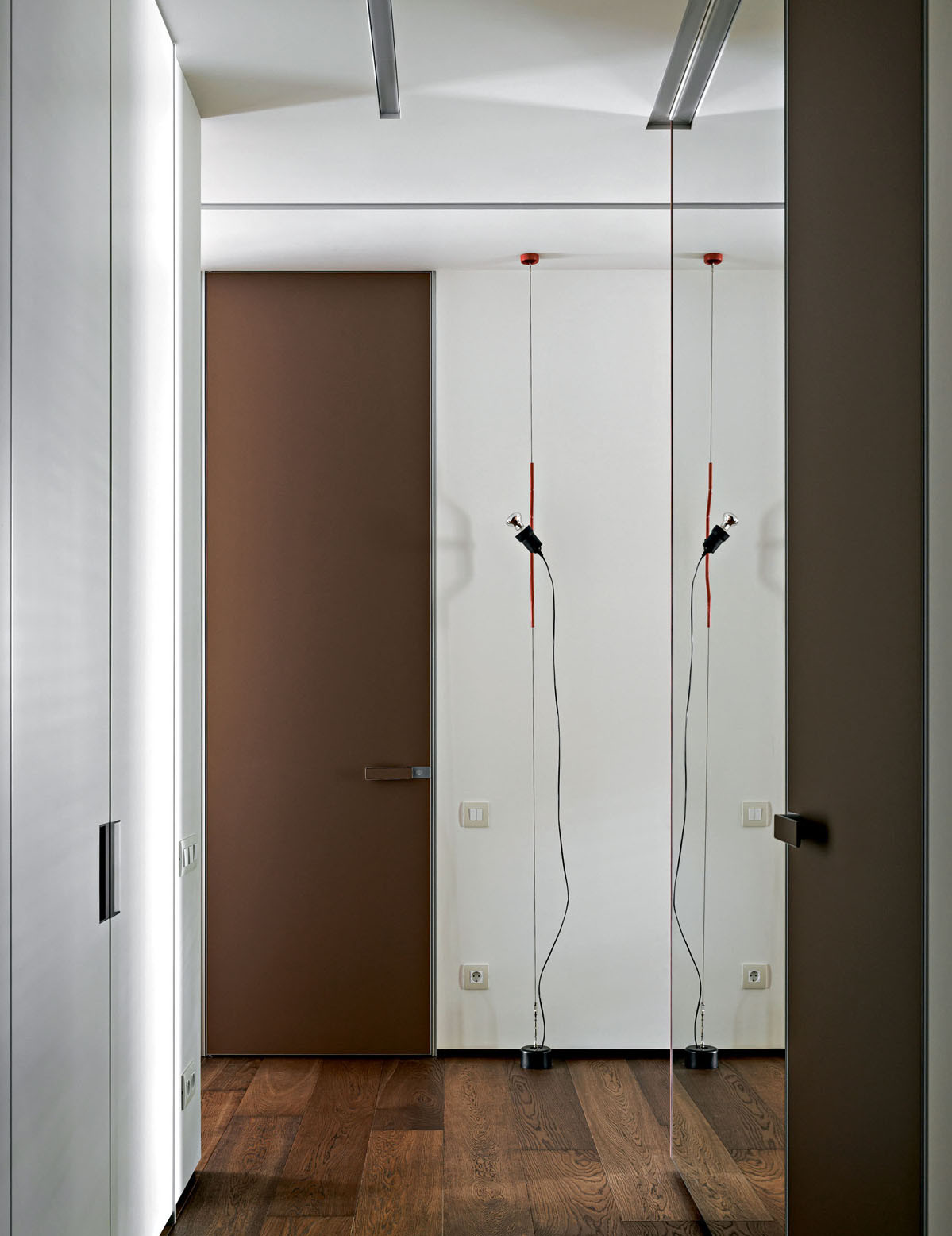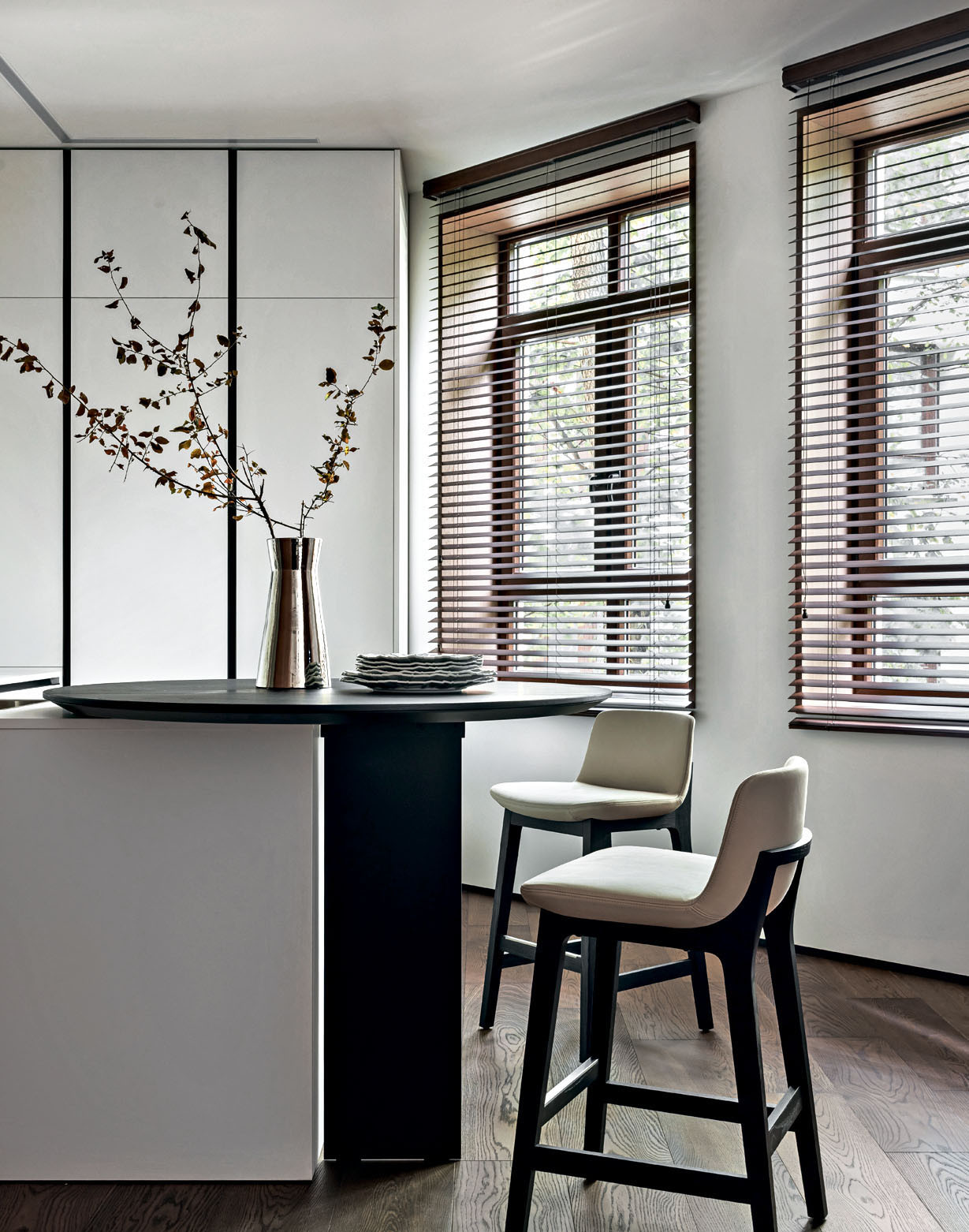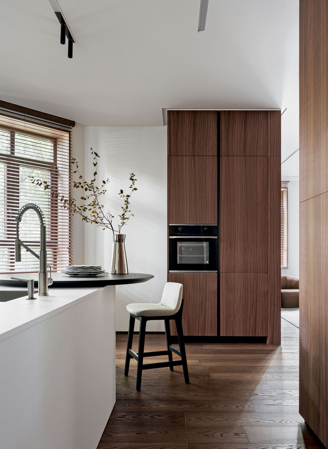 Исходная планировка была переосмыслена с точки зрения эргономики и потребностей домочадцев. Пространство гостиной объединили с кухней, дверные проемы расширили, а за счет площади прихожей организовали удобную хозяйственную комнату. Разбросанные по квартире системы хранения стали более продуманными и сосредоточенными. В основе цветовой гаммы — светлые монохромные стены, создающие ощущение простора и легкости. Им противопоставлены глубокие оттенки, навеянные каштанами за окном. Этот природный акцент проявился в лаконичных панелях из шпонированного американского ореха. Напольное покрытие из инженерной доски обожженного дуба и керамогранит с текстурой травертина в санузлах добавили графичности и тактильной теплоты. Элегантные двери Rimadesio с полотнами из матового стекла подчеркивают чистоту линий. Кухонная мебель, включающая остров, решена в строгой темной гамме. Все оконные проемы также подчеркнуты панелями из темного дуба. Этот насыщенный оттенок объединяет пространства, подчеркивая декор и детали во всей квартире, такие как барная стойка от Poliform из черного вяза на кухне. «Мы долго определялись с расположением кухни, пока не придумали вынести два высоких пенала на границу с гостиной, объединив их материалом с отделкой ТВ-панели. Это создало цельный архитектурный блок и четко обозначило переход между зонами», — дополняет Татьяна. Особую роль играет освещение. Подвесной светильник Moon от Davide Groppi парит над обеденным столом, а световые линии Infinito Endless, расположенные горизонтально и вертикально в гостиной, спальне и санузле, создают эффект бесконечности и работают как самостоятельные арт-объекты. Этот интерьер — индивидуальная история, где монохромная основа и строгость минимализма смягчены теплом натуральных материалов. Пространство, где каждая деталь создает атмосферу спокойной, вневременной роскоши.