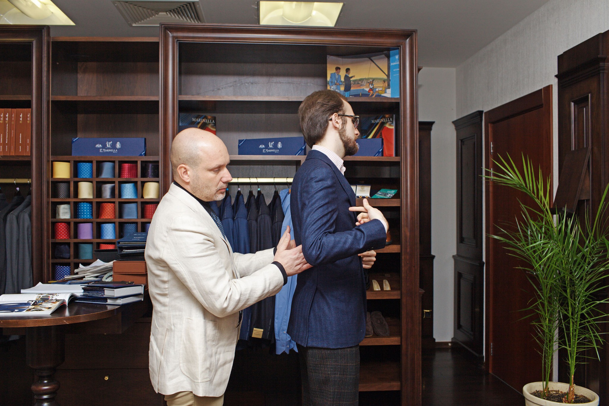 Чтобы попасть в московский шоурум, одного адреса знать недостаточно. Помещение скрыто на третьем этаже офиса General Inve, помпезно украшенного антикварной мебелью, наградами и картинами с видами Неаполя. Пройдя сквозь лабиринт кабинетов, обнаруживаешь себя в уютном пространстве, рядом с которым расположена полноценная портновская мастерская. В ней Паскуале с коллегами лично подгоняют изделия, если примерка показывает необходимость доработки.