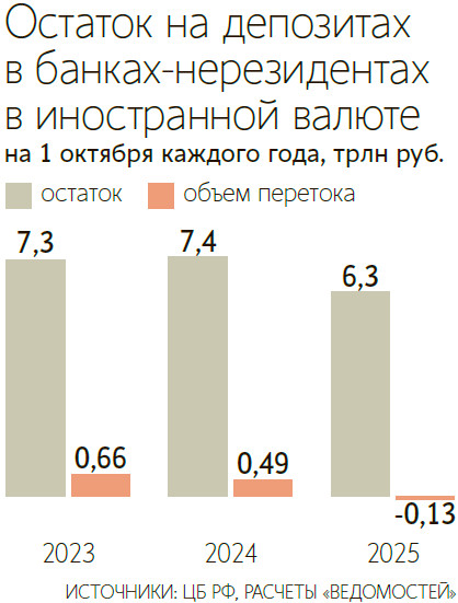 В то же время, согласно статистике Банка России, в прошлом году впервые с 2018 г. приток средств из-за рубежа превысил отток. За 2025 г. объем переведенных гражданами из зарубежных банков в Россию средств составил 165,2 млрд руб., следует из оценочных данных ЦБ по операциям сектора «домашние хозяйства». До прошлого года ситуация была противоположной: в 2024 г. россияне вывели в заграничные банки на 479,9 млрд руб. больше, чем вернули в страну, в 2023 г. отток составил 869,5 млрд руб., а в 2022 г. отток был рекордным за все время наблюдения – 2 трлн руб.