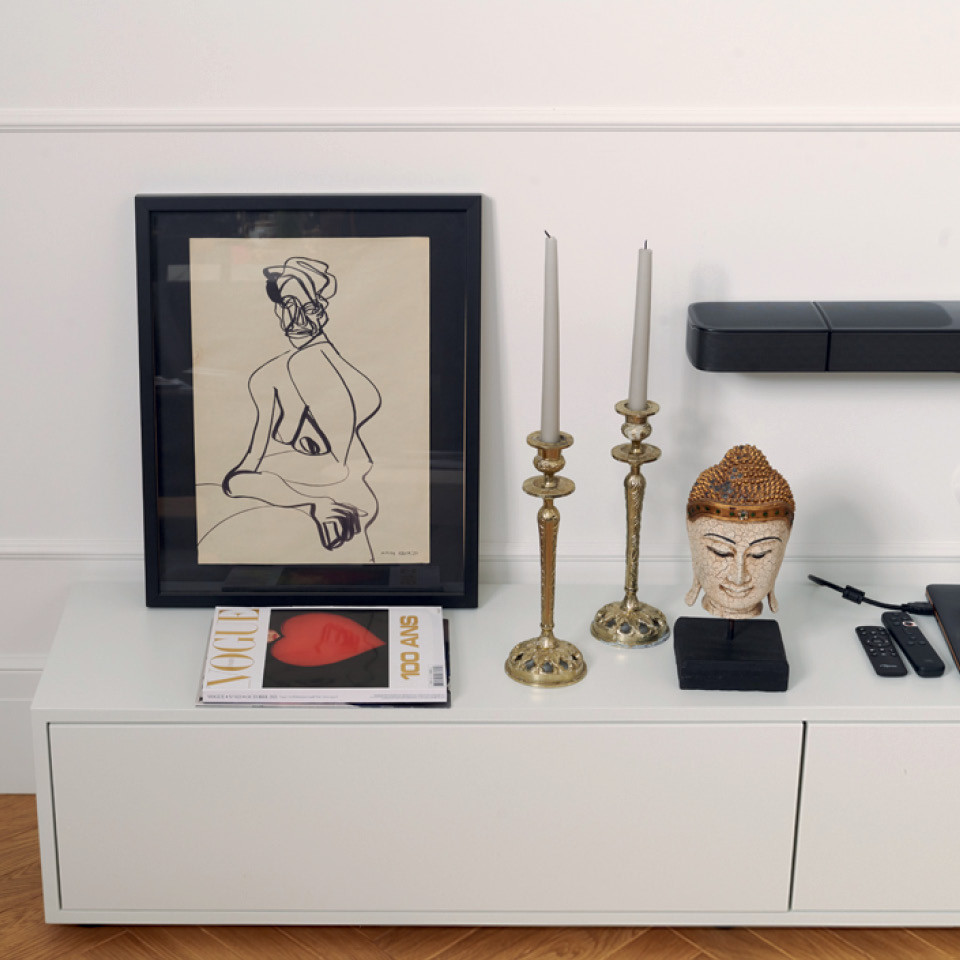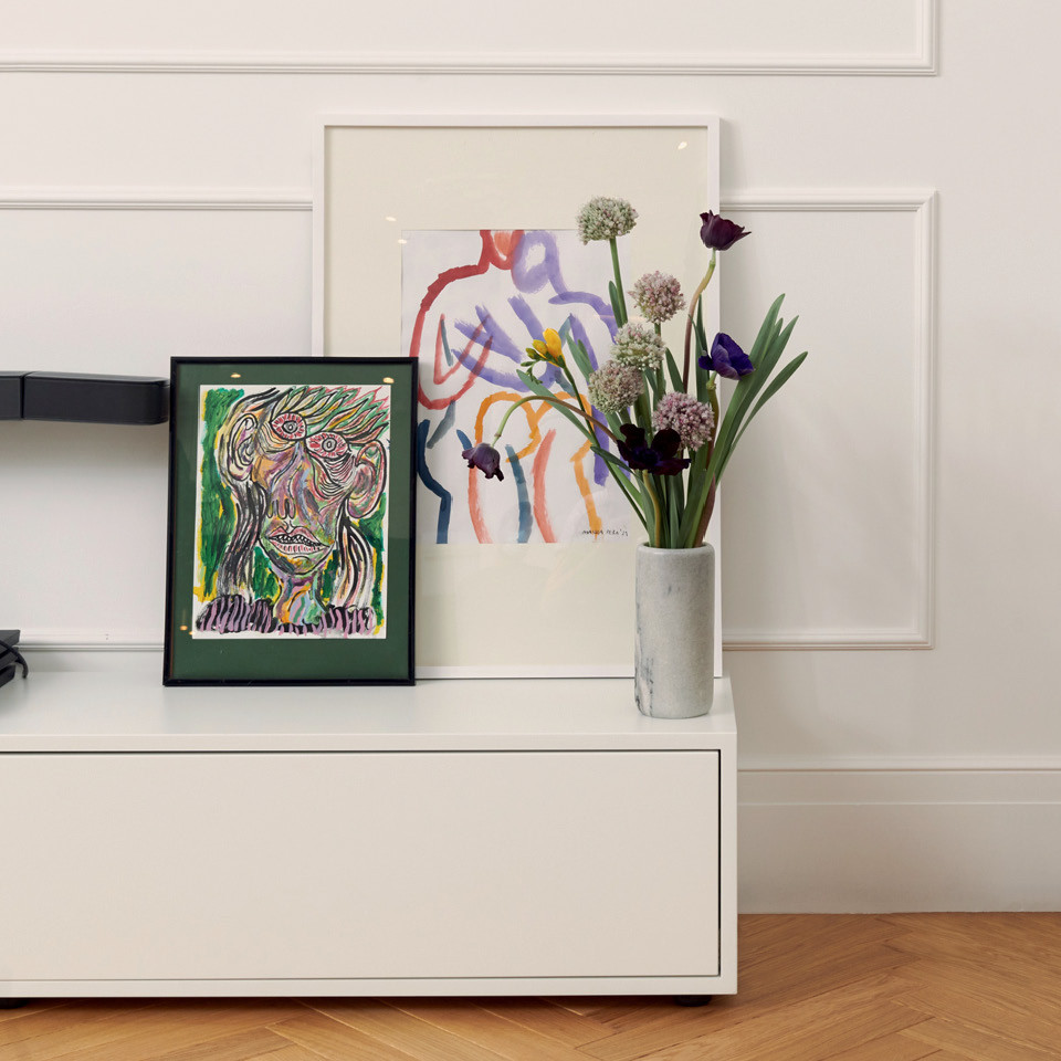 В трех метрах от читальни Ивана располагается Настин рабочий стол Palette с полочкой из черного мрамора и «стул-барашек» Elefy из коллекции испанского дизайнера Хайме Айона для датской компании &Tradition. И все же ее любимое место — уголок в спальне с креслом Pierre Paulin 1970‑х годов. «Фабрика во Франции еще работает, но мне было важно найти оригинал тех времен. Сработали хештеги в инстаграме (соцсеть признана в РФ экстремистской и запрещена), я листала ленту днями и ночами. Так и вышла на мужчину из Бельгии, который готов был это кресло продать».