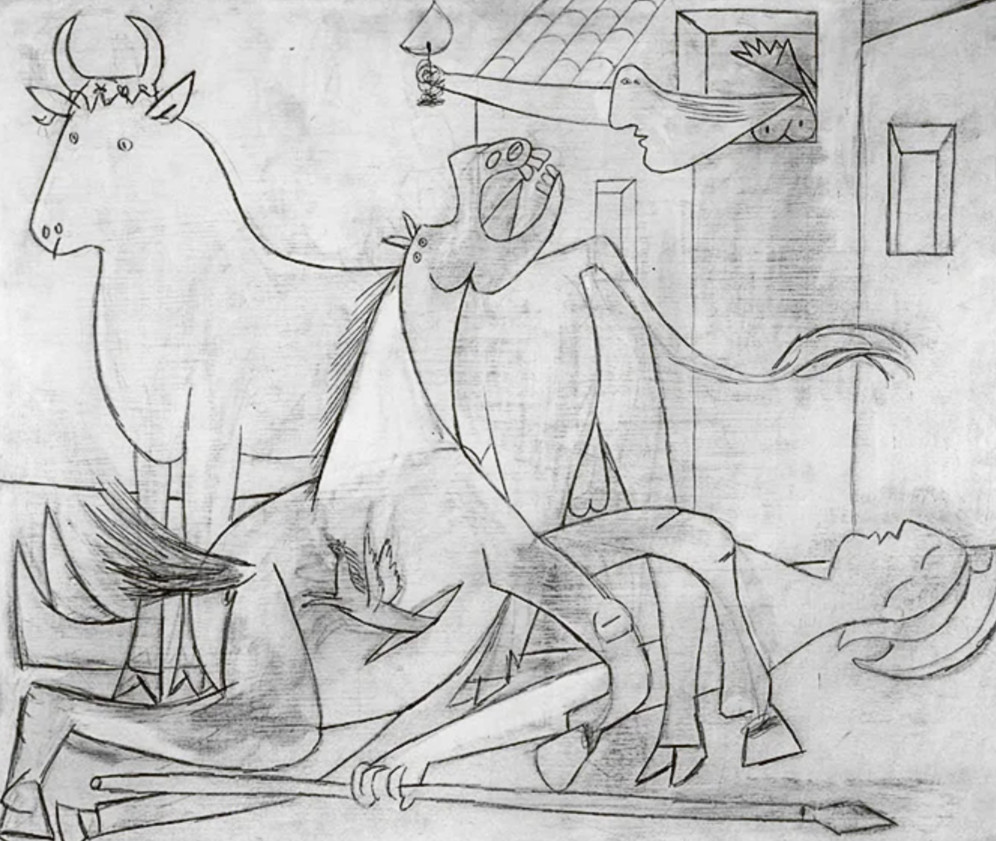 Но Герника, как вспоминал Рафаэль Альберти, «сразила Пикассо как удар бычьего рога». Она стала катализатором, взрывом, выбившим Пикассо из кризиса — в работу. Первого мая появляется набросок номер один, три персонажа: бык, раненый конь, женщина со светильником в руке. Условность предельная. В первый день эскизов всего пять, темп работы нарастает в ритме crescendo, кроме изначальной троицы появляются распростертые тела воина и женщины, а также рыдающая мать с мертвым ребенком. Детали эскизов варьируются. То из раны в боку коня вылетает крылатый Пегас, а сам конь корчится от боли, то он топчет копытами раненого воина, то превращается в понурую детскую лошадку (недаром именно в эти годы Пикассо мечтает «рисовать как ребенок»), то встает на дыбы с пугающим оскалом. У быка то грозный облик, то отрешенно-застылый, то совершенно человеческий, с большими грустными глазами.