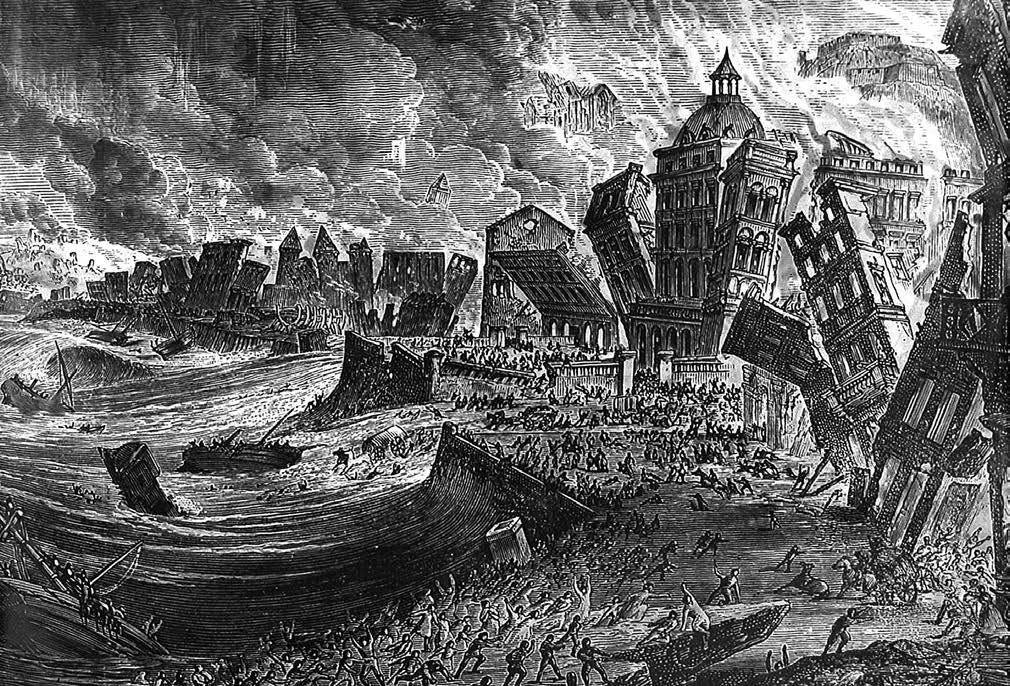 Первого ноября 1755 года, после мощного землетрясения, на западное побережье Испании, Португалии и Марокко обрушилось цунами. Больше всего пострадал Лиссабон. По некоторым оценкам, там погибло до 100 тысяч человек, причем большая часть из них – это жертвы волны, захлестнувшей город (в канун бедствия в нем проживало 275 тысяч человек). В Лиссабоне было разрушено 85% зданий, в их числе знаменитые королевские дворцы и библиотеки.