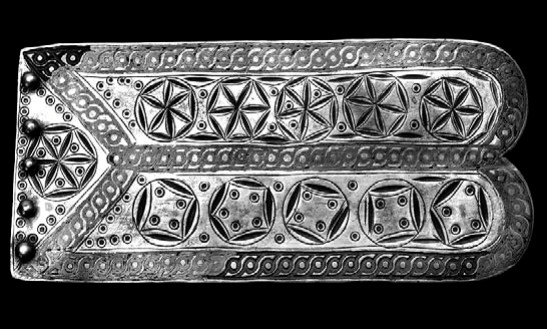 Пряжка из клада в Замости крупная и массивная, с толстым язычком, конец которого имитирует голову зверя. В паре с пластиной – наконечником ремня они демонстрируют стилеобразующее триединство серебро – позолота – чернь, весьма эффектно передающее в общем-то незамысловатый геометрический орнамент (рис. 1а, 1б). Крупные двупластинчатые застежки соответствуют характерным традициям германцев. Фибулы данного типа, но поскромнее, часто попадаются в захоронениях и кладах Северной Европы, однако украшений столь высокого художественного уровня и такой изящной работы известны лишь единицы. Археологи склоняются к мысли, что это произведения высококлассных римских ювелиров. Фибулы из Замости могли быть изготовлены и отосланы в качестве дара вандальской княгине с вполне определенной целью. От нападений на дунайский лимес гуннов часто отвлекали конфликты на севере, ведь подчиненные народы не всегда покорно склоняли головы. И поэтому часть продукции барбарикарий уходила к племенам, которые в нужный момент поднимали восстание в тылу у кочевников. А может, и родственные связи Стилихона повлияли на судьбу этих уникальных вещей.